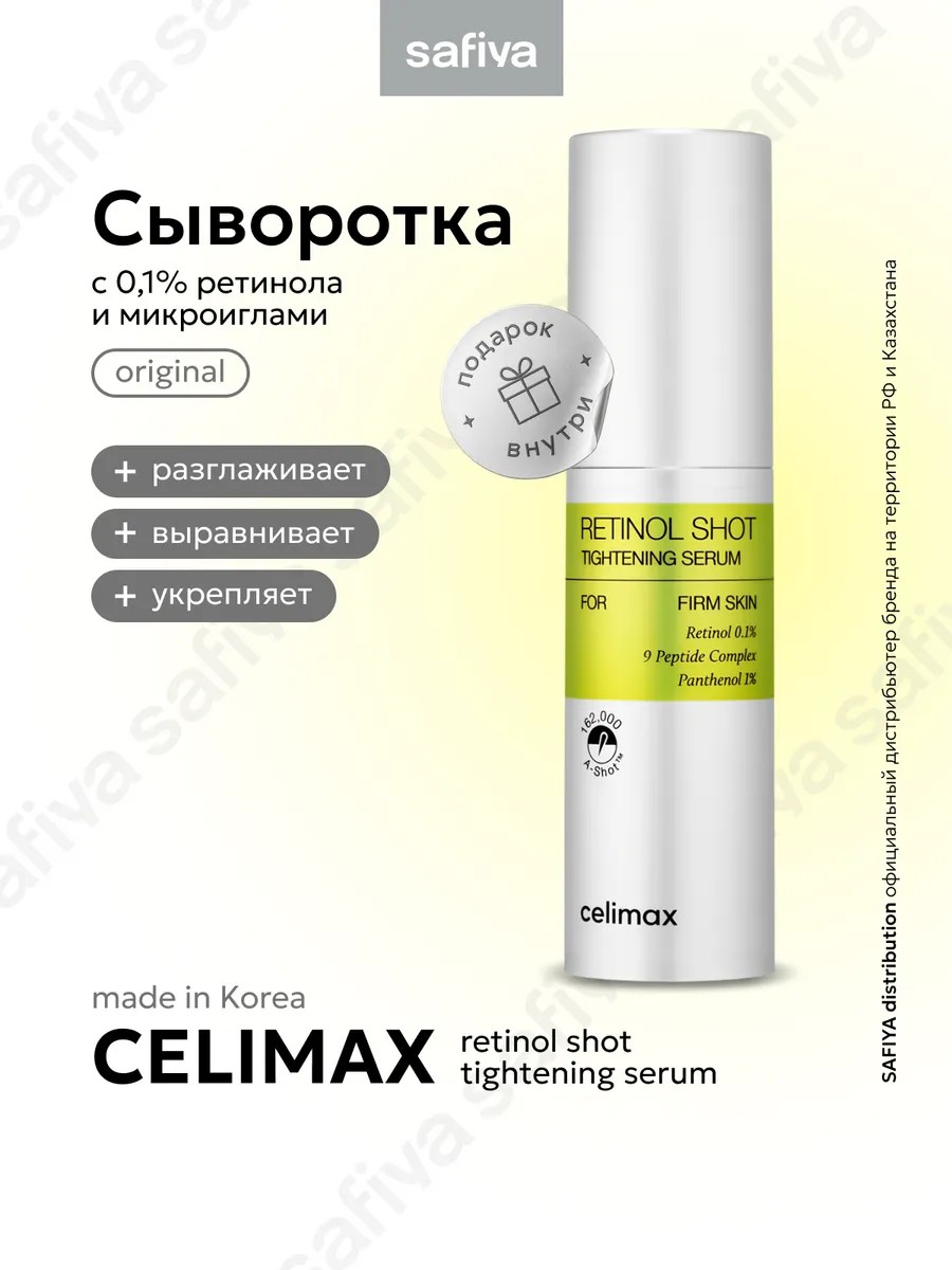 Celimax Retinol Shot Tightening Serum — инновационное антивозрастное средство для кожи лица с 0,1% ретинола и микроиглами A-Shot от корейской косметики Селимакс (Силимакс). Этот крем для ухода направлен на подтягивающий лифтинг, глубокое омоложение, увлажнение и обновление кожи, особенно эффективен против дряблой кожи и возрастных изменений.