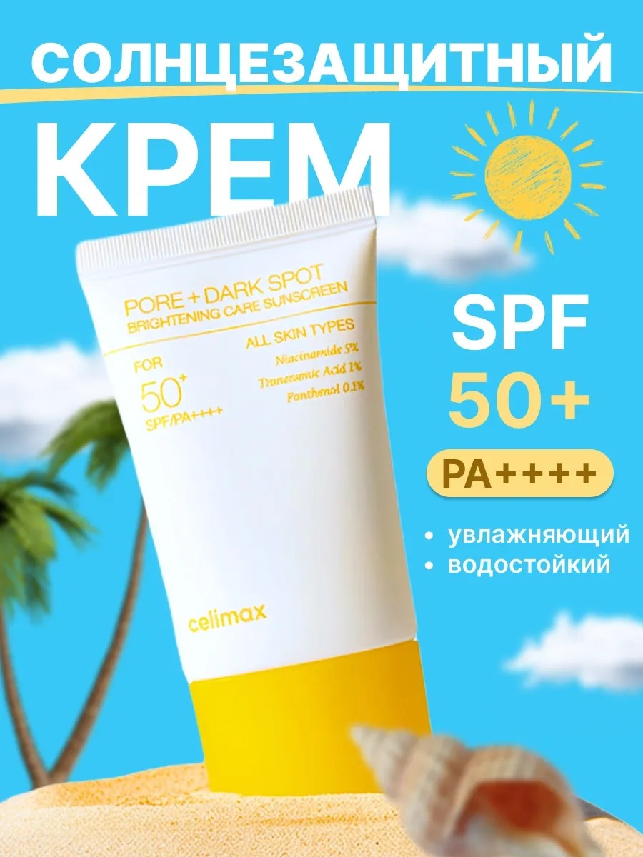 Солнцезащитный крем для сияния кожи Celimax Pore+Dark Spot Brightening Care Sunscreen SPF 50+ PA++++ оберегает кожу от солнечных лучей, создан на химических фильтрах нового поколения (Diethylamino Hydroxybenzoyl Hexyl Benzoate, Ethylhexyl Triazone, Methylene Bis-Benzotriazolyl Tetramethylbutylphenol, Diethylhexyl Butamido Triazone), они не раздражают кожу, имеют высочайший фактор защиты от ультрафиолета, являются фотостабильными не требуют обновления каждые 2 часа. Транексамовая кислота в составе осветляет кожу, блокирует синтез меланина, предотвращает появление пигментации, также имеет противовоспалительные свойства.