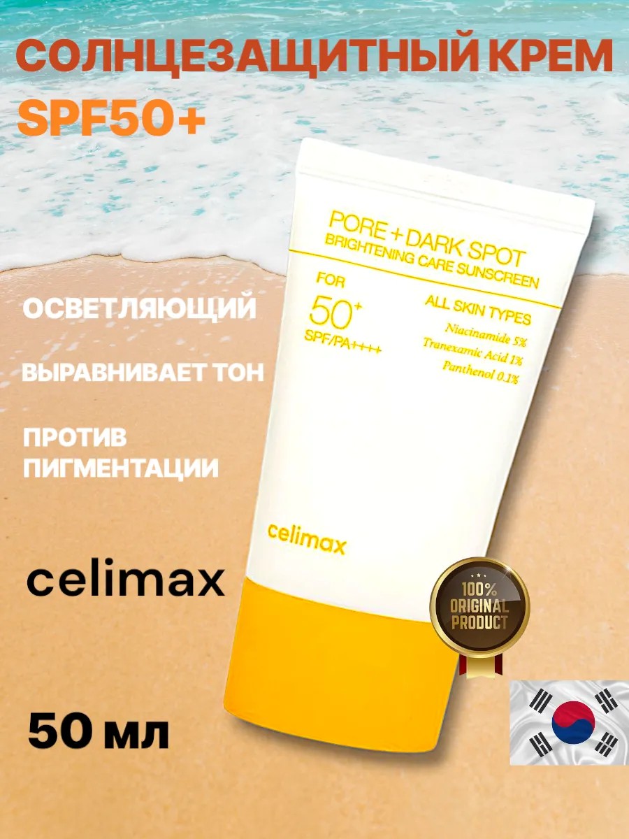 Celimax Pore and Dark Spot Brightening Care Sunscreen, 50 мл — это солнцезащитный крем с осветляющим эффектом, который защищает кожу от вредного воздействия ультрафиолетовых лучей и одновременно борется с несовершенствами кожи, такими как расширенные поры, пигментные пятна, веснушки и сальные нити. Обладая легкой текстурой, крем Селимакс быстро впитывается, не оставляя ощущения липкости и жирного блеска, что позволяет использовать его под макияж. Крем обеспечивает надежную защиту от UVA и UVB-лучей с высоким степенб защиты SPF 50+, предотвращая фотостарение и появление новых пигментных пятен. Благодаря своей универсальной формлуе крем отлично подходит для всех типов кожи, включая чувствительную. Основным активным компонентом крема является ниацинамид в концентрации 5%, который эффективно осветляет кожу, устраняет пигментные пятна и следы постакне, а также выравнивает её общий тон. Дополняет полезное действие ниацинамида транексамовая кислота в концентрации 1%, обеспечивающая подавление синтеза меланина, блокируя таким образом появление нежелательной пигментации, а также активно сужающая поры. А благодаря содержанию 0,1% пантенола крем обеспечивает мощный защищающий, раглаживающий и успокаивающий эффекты, в резульате чего оказывает максимально сбалансированное положительное действие. В результате использования солнцезащитного крема кожа получает надежную защиту от УФ-лучей и возможных ожогов, предотвращается преждневременное фотостарение и появление новых пигментных пятен. Крем помогает сократить выраженность пор, осветлить уже существующую пигментацию и выровнять тон лица. Кожа выглядит более свежей, гладкой и защищенной, а ее текстура со временем заметно улучшается. Благодаря своему многофункциональному воздействию, крем не только защищает кожу, но и заботится о её здоровье.