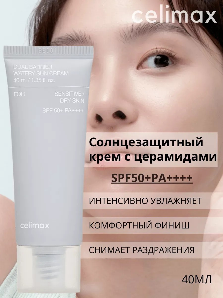 Солнцезащитный крем с комплексом церамидов Celimax Dual Barrier Watery Sun Cream SPF50+PA++++ для лица от корейского бренда представляет собой эффективное средство для защиты и ухода за вашей кожей. Он идеально подойдет для женщин, мужчин, девушек и подростков, желающих сохранить свою красоту и здоровье кожи в условиях солнечной активности, на море, в отпуске или поход в горы