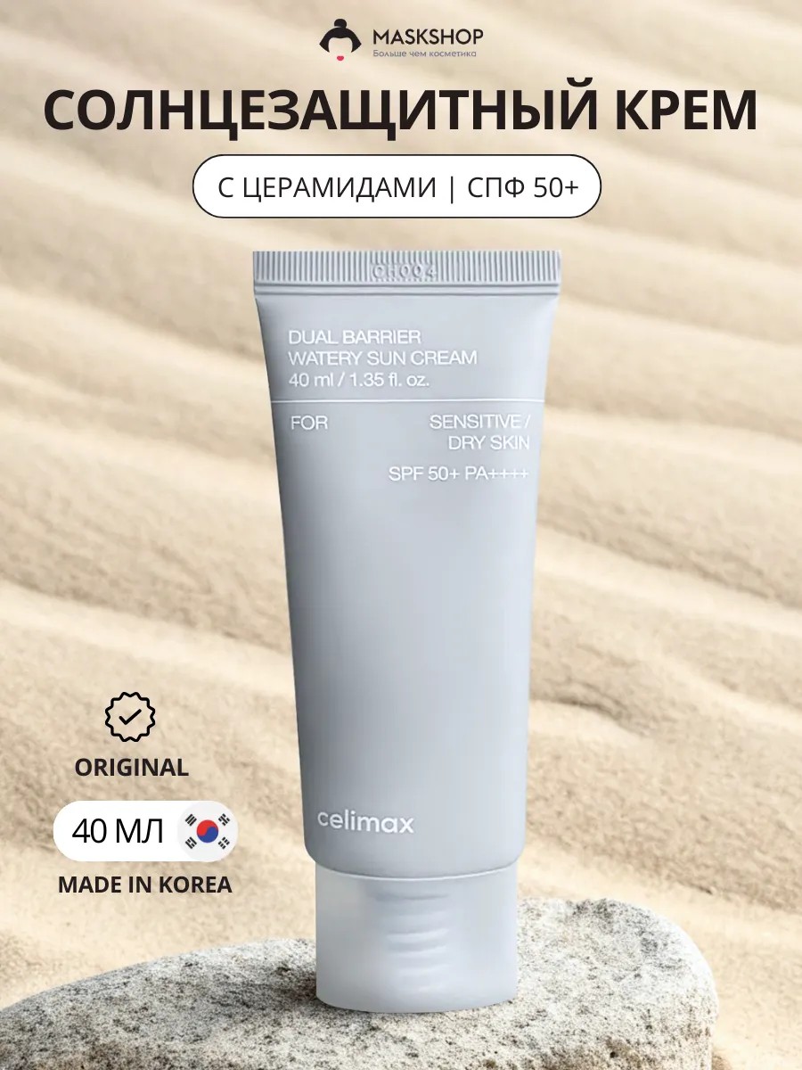 Celimax Dual Barrier Watery Sun Cream SPF 50+ PA++++ is formulated with a physical filter, zinc oxide, which reliably protects the skin from UV rays without increasing sensitivity and preventing pigmentation and sunburn. The ceramide complex restores the skin, strengthens its barrier, promotes rapid healing of damage, and improves skin health. Rosemary oil normalizes sebaceous gland function, effectively fights inflammation, suppresses pathogenic flora, and evens out skin tone. The sunscreen reliably protects against the harmful effects of UVB and UVA rays, spreads comfortably on the skin, does not whiten, and is not noticeable throughout the day. Directions: Apply sunscreen to skin at the last step of your skincare routine, using the two-finger rule. Spread evenly. Wait until completely absorbed.