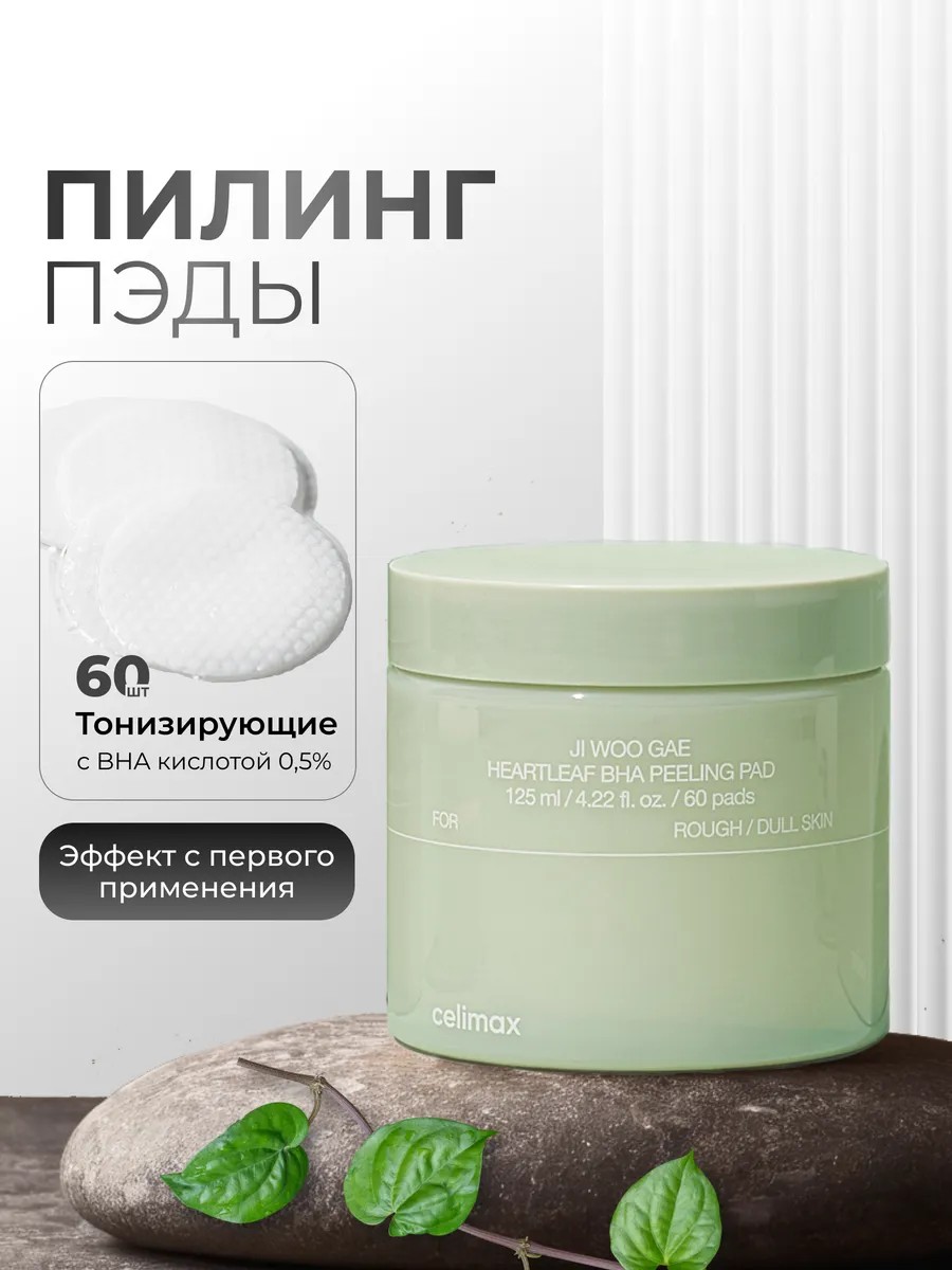 Тонизирующие пилинг-пэды с BHA-кислотой Celimax Ji Woo Gae Heartleaf BHA Peelind Pad - это пропитанные специальным составом диски, которые сочетают в себе сразу несколько этапов ухода. Устраняют жирный блеск, очищают поры и предотвращают их закупорку, препятствуют появлению чёрных точек и воспалений, не пересушивают и не провоцируют раздражение. Кислотные пэды для лица обладают противовоспалительными и смягчающими свойствами, выравнивают тон и стимулирует регенерацию. Содержит BHA-кислоту, экстракты хауттюйнии, центеллы и зелёного чая. Благодаря содержанию кислот диски мягко удаляют ороговевшие клетки, загрязнения и излишки себума. Это способствует обновлению кожи, выравниванию рельефа и улучшению цвета лица. Пэды тонизируют кожу, сужают поры, подготавливают ее к дальнейшему уходу и повышают эффективность используемых средств. Селимакс диски содержат увлажняющие компоненты, которые смягчают кожу, предотвращают сухость и раздражение. CELIMAX – популярный бренд корейской уходовой косметики, известный своими эффективными и безопасными формулами.