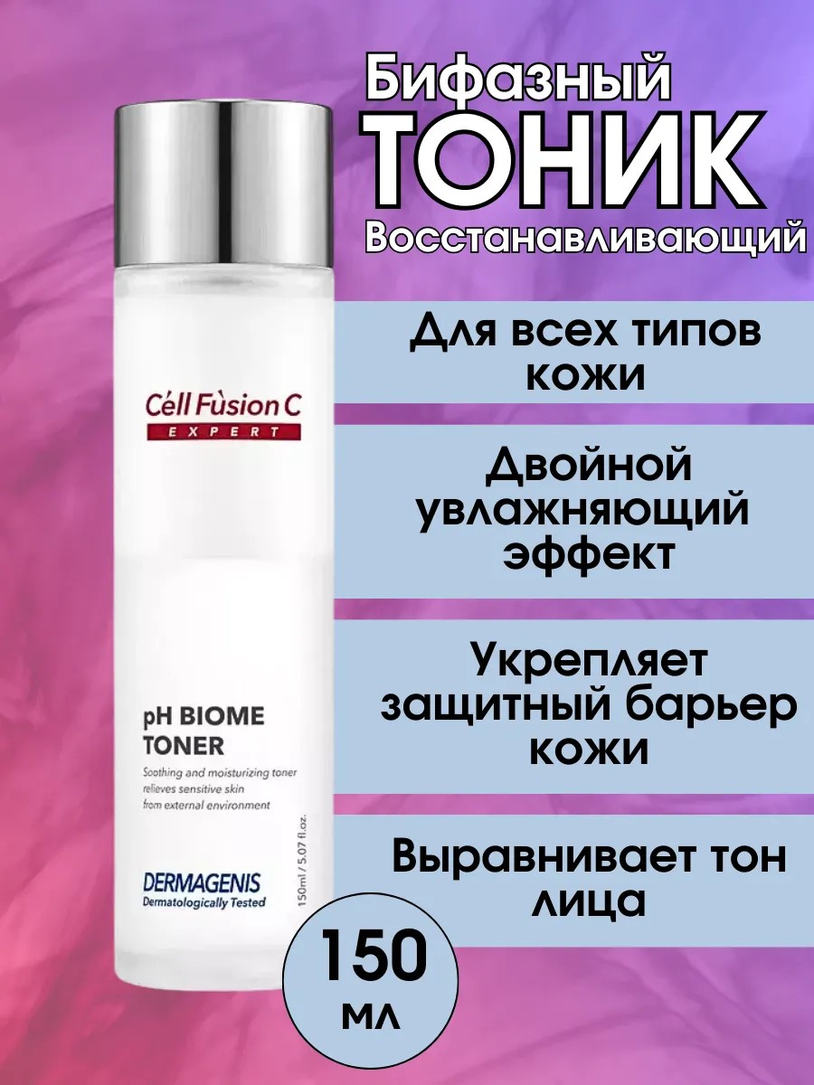 The two-phase pH BIOME Toner from the Korean brand Cell Fusion C is a restorative treatment designed to intensively hydrate and nourish dry, irritated skin with a compromised hydrolipidic barrier, promoting a healthy, supple, and radiant appearance.