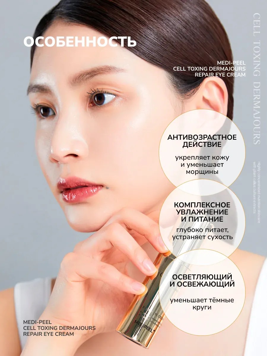 Укрепляющий крем для век со стволовыми клетками Medi-Peеl Cell Toxing Dermajours Repair Eye Cream стимулирует процесс синтеза новых коллагеновых и эластиновых волокон для интенсивного повышения упругости кожи. Укрепляет тургор, активно увлажняет и питает. Корейский крем для кожи вокруг глаз заметно сокращает выраженные глубокие и мимические морщинки, мягко осветляет тёмные круги под глазами и борется с тусклостью. Антивозрастнй крем для глаз от Medi-Peеl Корея восстанавливает повреждённый матрикс кожи, разглаживает рельеф, устраняет мимические морщины в области вокруг глаз и препятствует появлению возрастных изменений. Стволовые клетки эдельвейса альпийского направлены на стимуляцию аквапоринов, которые являются «водными каналами» в клеточных мембранах и обеспечивают идеальный баланс увлажнения кожи, а так же восстанавливают защитные функции. Крем можно использовать не только на область век, но и в зонах, требующих дополнительного ухода: носогубные складки, межбровная морщина, лоб и шея. Масло оливы смягчает и питает, восстанавливает кожные покровы, имеет антиоксидантные свойства. Комплекс из 9 видов пептидов увеличивает упругость, ускоряет процессы выработки организмом собственных волокон коллагена и эластина. Укрепляет защитный барьер кожного покрова. SYN-AKE - оказывает ботулоподобный эффект: уменьшает глубину морщин на лбу, носогубных складках, вокруг глаз. SYN-COLL - мощный антивозрастной комплекс, стимулирующий синтез коллагена. Улучшает тургор, уменьшает глубину выраженных мимических и возрастных морщин, разглаживает рельеф и подтягивает. Oriental Beauty Fruits Newplex (экстрактов фруктов инжира, граната, гинко билоба, шелковицы) успокаивает, снимает зуд и раздражения, стимулирует клеточную регенерацию. Fresh Bud no.6 (экстракты брокколи, люцерны, пекинской капусты, пшеницы) укрепляет иммунитет и заживляет воспаления. Экстракт коры магнолии замедляет разрушение коллагеновых и эластиновых волокон, сохраняет упругость тканей и их плотность.