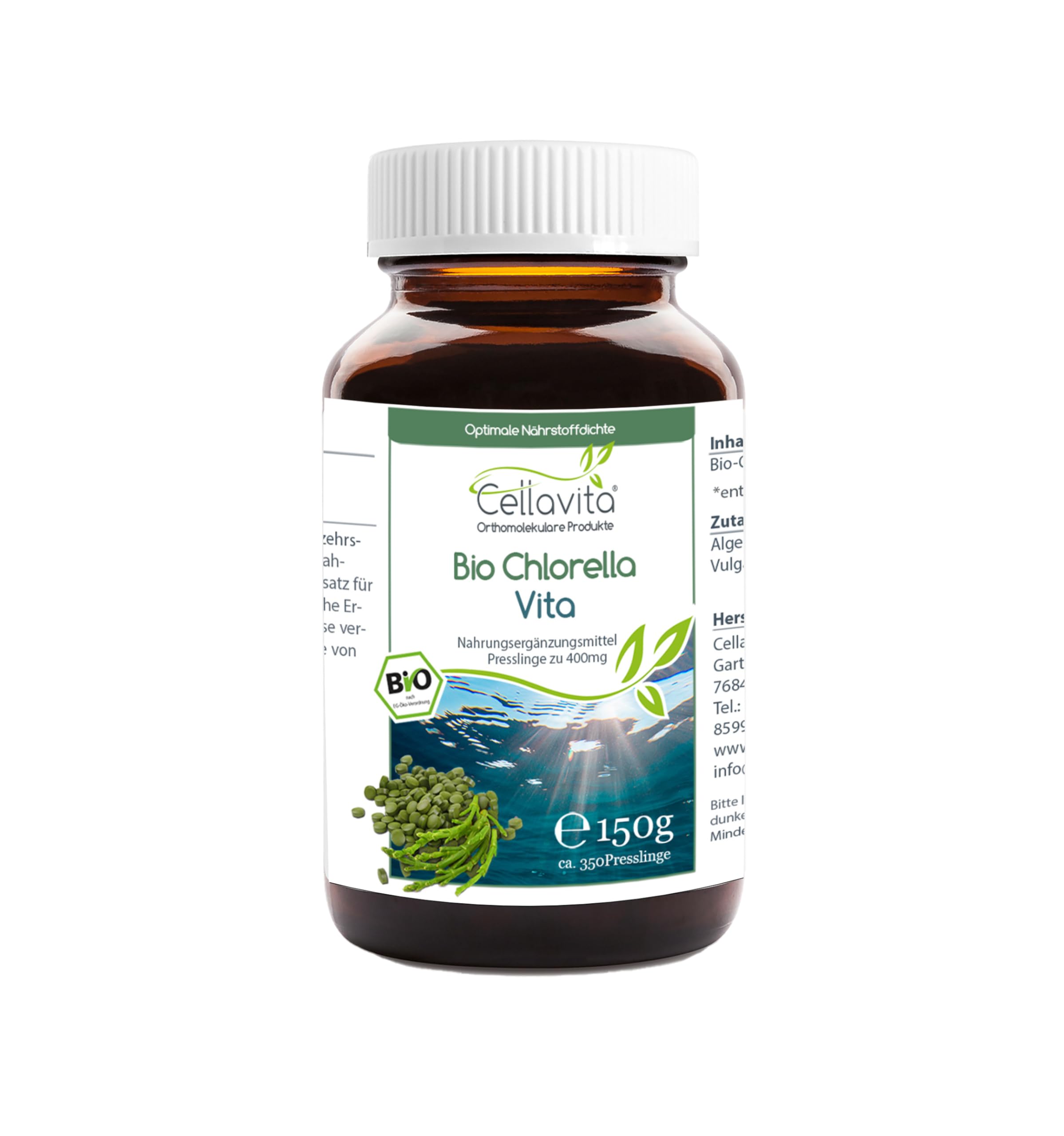 Certifié bio. Veuillez comparer le prix du gramme ml avec nos plus grands récipients. Sans agent auxiliaire ni agent de démoulage. Chlorella Vulgaris. Chlorella Vita Compresses.