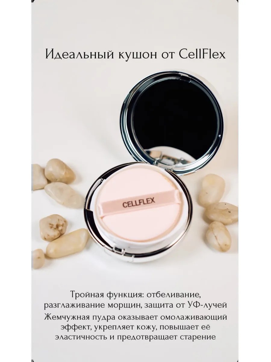 Косметика от корейского бренда CellFlex/ Кушон 2в1 CellFlex Perfect CushionSPF 42 PA++, подчеркивает красоту и здоровье кожи. Кушон относится к категории BB-средств и сочетает в себе уход и лёгкое тональное покрытие. Он прекрасно выравнивает тон кожи, увлажняет и придаёт естественное сияние. Продукт создан на основе натуральных ингредиентов, не содержит силиконов и подходит даже для чувствительной кожи. Дополнительно обеспечивает надёжную защиту от солнца с высоким SPF 42, что особенно важно для сохранения молодости и здоровья кожи. Идеален для повседневного использования, легко наносится и подходит для всех типов кожи. Особая комбинация экстракта жемчуга и экстракта цветка камелии тонизирует кожу и придает ей сияние. Жемчужная пудра содержащаяся в кушоне оказывает омолаживающий эффект, укрепляет кожу, повышает эластичность, стимулирует процесс регенерации клеток кожи, восстанавливает, успокаивает и снимает раздражение. Стеариновая кислота обеспечивает идеальное покрытие кожи.Ингредиенты олеиновой кислоты и конхиолина осветляют кожу, а также придают ей сияние.Пептиды, содержащиеся в составе продукта, разглаживают морщины и придают коже более молодой и здоровый вид, также омолаживает и увлажняет кожу. Защищает кожу от ультрафиолетовых лучей,скрывает несовершентсва лица. Выглядит натурально и подстраивается под любой тон кожи. В комплекте с кушоном идет запасной кушон + спонжик. Способ применения: нанесите небольшое количество кушона на кожу лица, акцентируя внимание на проблемных зонах и растушуйте спонжем. Отлично подходит для использования каждый день. Рекомендуется наносить после распыления мульти эссенцией для лица CellFlex (Арт. 238851475).
