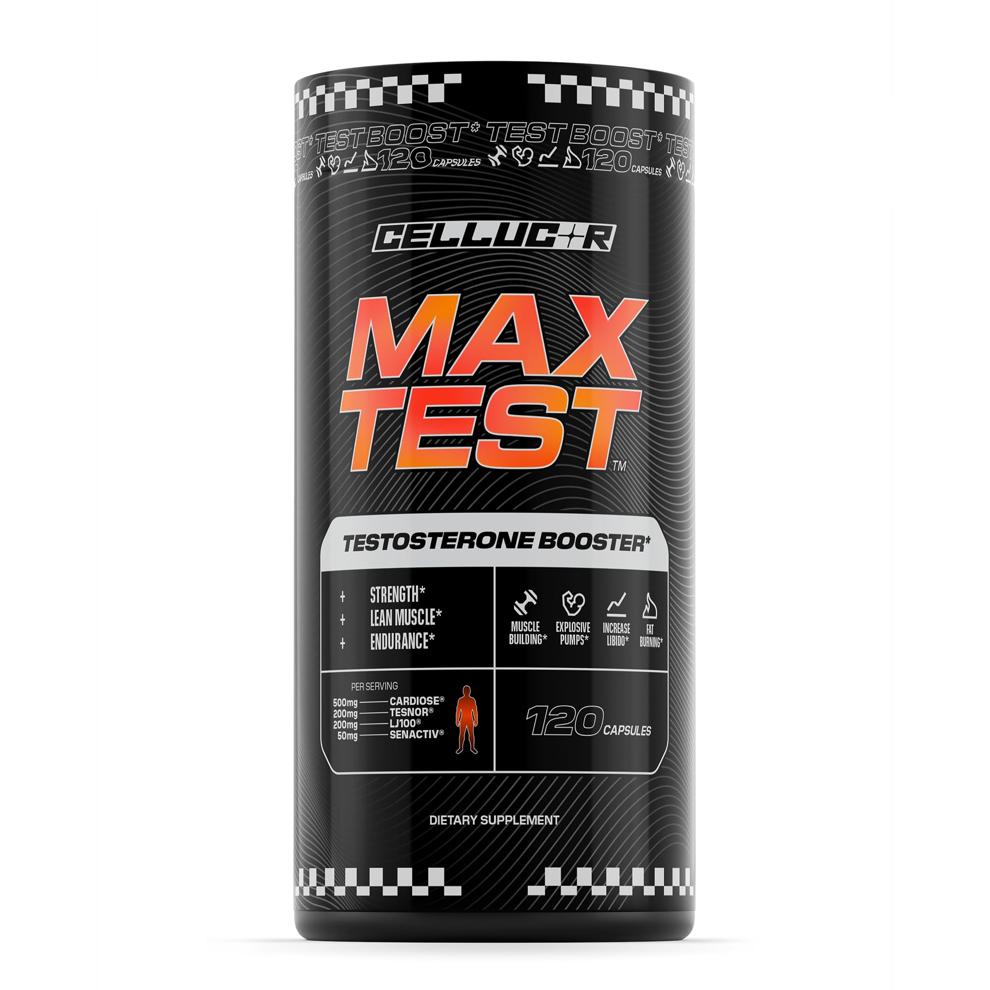 "Build muscle, burn fat, and boost endurance with Cellucor Max Test™! Engineered with advanced ingredients, Max Test™ helps boost test levels to achieve that muscular physique. INGREDIENTS: -200mg Tesnor : Clinically studied, patented ingredient shown to enhance testosterone, muscle strength, and size. -500mg Cardiose : Clinically studied, patented ingredient shown to improve physical performance. -200mg LJ100 : Clinically studied, patented ingredient shown to support libido and boost testosterone. -50mg Senactiv : Clinically studied, patented ingredient that elevates endurance, recovery, and energy while supporting senescent cell clearance and new muscle cell generation. Testosterone levels already within a normal range."