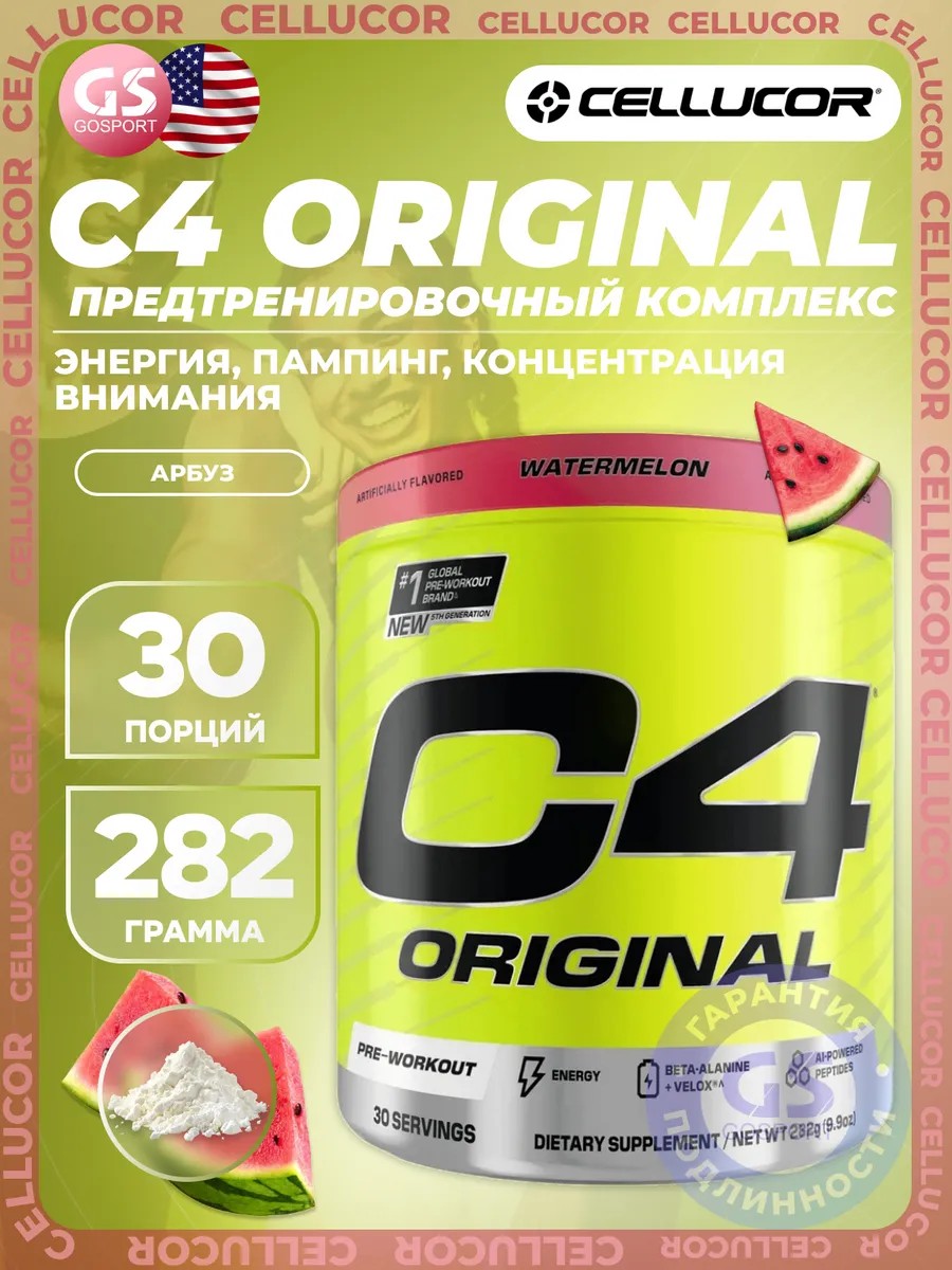 Годен до 30.09.2027. Предтреник C4 Pre-Workout 282 г, Арбуз. Предтренировочный комплекс С4 Original создан для того, чтобы поднять вашу энергию, мышечную выносливость и пампинг на новый уровень. Улучшенная формула предтреника C4 от Cellucor, который включает теперь запатентованный ингредиент TeaCor, дающий энергию быстро и при этом обеспечивающий ее продолжительное влияние на организм. В формулу данного предтреника также включены бета-аланин, кофеин, аргинин, витамины из группы B и специальная энергетическая смесь, которые помогут вам дольше сохранять высокую работоспособность на тренировке и получать хорошие спортивные результаты. Формула C4 включает также бета-аланин, креатин нитрат и аргинин. Бета-аланин важен для нашего организма как соединение, помогающее бороться с мышечной усталостью, поскольку участвует в производстве карнозина – буфера молочной кислоты. Креатин нитрат поддержит сократительную активность мышц на высоком уровне, поскольку способствует синтезу АТФ – основного источника энергии для мышц, особенно в самом начале тренировки. Так вы сможете значительно улучшить силовые возможности своего организма. Аргинин за счет производства оксида азота повысит порцию ценных нутриентов и кислорода, приливающих к мышцам. В итоге вы сможете еще больше усилить потенциал своего тела. В формулу данного предтрена добавлена также специальная энергетическая смесь на основе N-ацетил-тирозина, безводного кофеина, экстракта бобов (DOPA) и TeaCor. Основной принцип воздействия данных компонентов состоит в том, что они улучшают когнитивную активность мозга. В первую очередь речь идет о концентрации внимания и высокой умственной работоспособности. Ведь поддерживать себя в форме во время тренировки необходимо не только на физическом уровне, но и на ментальном. Соединения из данной смеси способствуют также повышению настроения, чтобы ваш боевой дух невозможно было сломать до самого конца тренировки. Предтренник С4 может стать полезным компонентом профессионального спортивного питания для спортсменов и людей, занимающихся спортом или фитнесом. Продукт подходит для мужчин и женщин, заботящихся о своем здоровье и красоте. Рекомендации по приему пищевой добавки: смешайте мерную ложку с 120-240 мл воды и выпейте за 20-30 минут до тренировки. Не превышайте рекомендуемую норму. Не используйте более двух мерных ложек в день. Пейте во время приема достаточное количество жидкости.