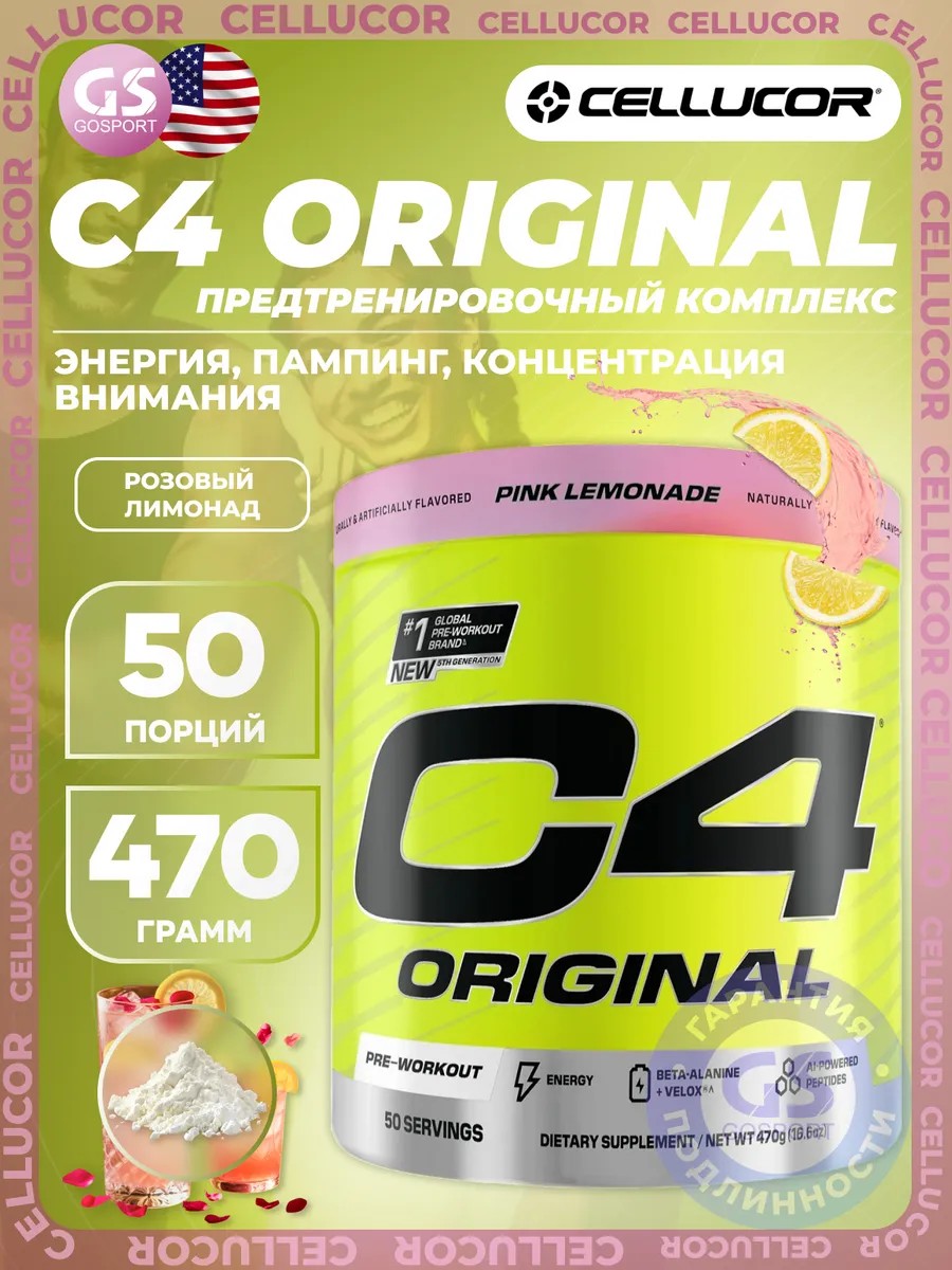 Expires until August 31, 2027. C4 Pre-Workout 390 g, Pink Lemonade. The C4 Original pre-workout complex is designed to take your energy, muscular endurance, and pumps to the next level. The improved C4 pre-workout formula from Cellucor now includes the patented ingredient TeaCor, which delivers energy quickly while ensuring its long-lasting effect on the body. This pre-workout formula also includes beta-alanine, caffeine, arginine, B vitamins, and a special energy blend, which will help you maintain high performance during training and achieve excellent athletic results. The C4 formula also includes beta-alanine, creatine nitrate, and arginine. Beta-alanine is important for our body as a compound that helps fight muscle fatigue, as it is involved in the production of carnosine, a lactic acid buffer. Creatine nitrate will maintain high muscle contractility by promoting the synthesis of ATP, the muscle's primary energy source, especially at the start of your workout. This will significantly improve your strength potential. Arginine, by producing nitric oxide, will increase the supply of valuable nutrients and oxygen to your muscles. Ultimately, you'll be able to further enhance your body's potential. This pre-workout formula also includes a special energy blend based on N-acetyl tyrosine, anhydrous caffeine, bean extract (DOPA), and TeaCor. The key effect of these ingredients is to improve cognitive performance. This primarily relates to concentration and mental performance. Maintaining your fitness during a workout is essential not only physically but also mentally. The compounds in this blend also help boost your mood, ensuring your fighting spirit remains strong until the very end. Pre-workout C4 can be a useful component of professional sports nutrition for athletes and those involved in sports or fitness. The product is suitable for men and women who care about their health and beauty. Directions for use: Mix one scoop with 120-240 ml of water and drink 20-30 minutes before training. Do not exceed the recommended dosage. Do not exceed two scoops per day. Drink plenty of fluids during use.