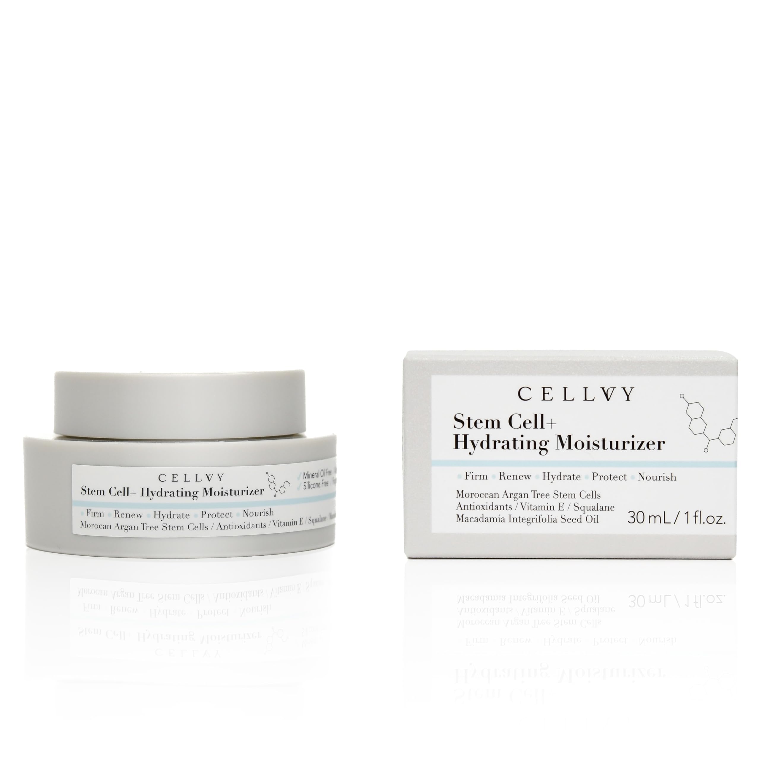 Antioxidant Rich. Packed with antioxidants like Vitamin E, this moisturizer helps protect your skin from free radical damage and environmental stressors. The antioxidants work to strengthen the skin barrier, promoting healthier, more resilient skin. These ingredients help maintain the skin's youthful appearance by defending against the daily wear and tear caused by external aggressors. Non-Toxic and Non-Comedogenic. This hydrating moisturizer is free from parabens, sulfates, mineral oil, and synthetic fragrances. CELLVY provides skincare that's suitable for even the most sensitive skin types. Without harmful chemicals, this product ensures that you're feeding your skin with the highest quality, non-toxic ingredients. Deep Hydration and Repair. With ingredients like Squalane and Macadamia Integrifolia Seed Oil, this moisturizer provides intense hydration and nourishment. Squalane mimics the skin's natural oils, ensuring that moisture is retained throughout the day. Macadamia Integrifolia Seed Oil penetrates deeply, delivering nutrients that leave the skin soft, smooth, and replenished. The long-lasting hydration ensures that your skin stays moisturized and radiant. Suitable for All Skin Types. Whether you have dry, oily, or sensitive skin, this moisturizer provides essential hydration without clogging pores or causing irritation. Its non-greasy, lightweight formula absorbs quickly, making it ideal for use under makeup or as part of a morning and evening routine. The formula is gentle enough for sensitive skin but effective in delivering deep hydration and moisture to all skin types. Advanced Anti-Aging Formula. Formulated with Moroccan Argan Tree Stem Cells, this moisturizer supports cellular regeneration and repair. The stem cells work deep within the skin to reduce the appearance of fine lines and wrinkles, promoting a smoother, more youthful complexion. By targeting the skin's cellular structure, this moisturizer helps to restore firmness and elasticity, providing long-term anti-aging benefits.