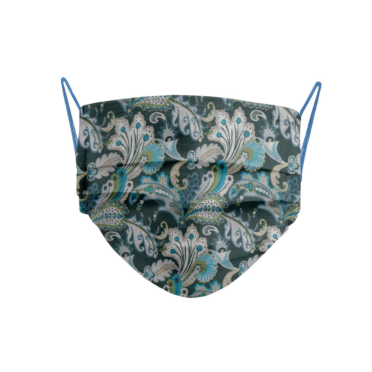 Funny mask made of liberty fabric.Liberty London Tana Lawn Mask on a green background with paisley patterns in turquoise, sky blue and white.Reusable hygiene mask for adults and children.Approved according to specification une0065: 2020.Made in Spain.The mask consists of cotton fabric with the advantages of organic fabrics and prevents skin irritation through synthetic masks.Available in adult size (9.5 x 18 cm).The mask consists of 2 layers.The inside in contact with the skin consists of 100 cotton with water -repellent surface, which meets the requirements of regulating the respiratory activity and effectiveness of the bacterial filtration.The outer layer consists of 100 Liberty cotton.Nasen stick to adapt the mask to the nose.Attention: This device is not a medical device within the meaning of Directive 93 42 or the Ordinance UR 2017 745, nor individual protective equipment within the meaning of the EU 2016 425