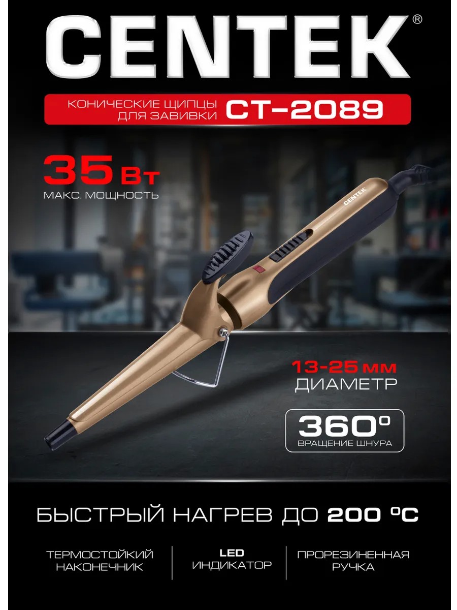 The Centek CT-2089 conical curling iron, with a diameter of 13-25 mm, guarantees perfect spiral styling and is convenient and easy to use. It has a maximum heating temperature of 200°C, and quickly reaches operating temperature. The ceramic-coated working surface is gentle on hair, preventing dryness. The ergonomic rubberized handle fits comfortably in your hand during styling. A built-in LED indicator lets you know when it's ready to use. A special heat-insulating tip ensures comfortable and safe use. The power cord continuously rotates, preventing tangling and restricting your movement. The iron features a convenient mechanical switch, a strand lock, and a stand. Built-in overheat protection significantly extends the life of the iron.