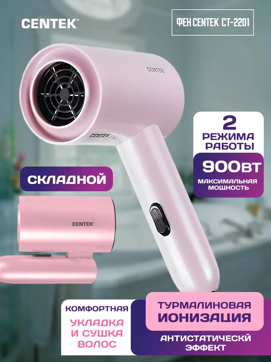 Стильный и компактный фен для волос CENTEK СТ-2201 PINK обладает удобной конструкцией, которая позволяет не занимать фену много места дома или в поездке. Благодаря турмалиновой ионизации волосы выглядят более послушными, ухоженными, не электризуются, и не теряют лишнюю влагу. Отличный подарок девушке, любимой, маме, сестре, коллеге на день рождения, 8 марта, юбилей.