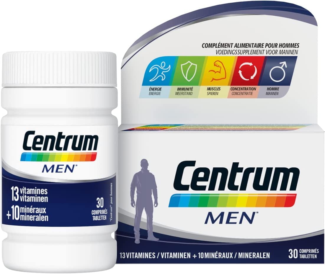 Centrum Men is a unique multivitamin complex scientifically adapted to the specific needs of men. It provides them with everything their body needs to stay in shape every day. Centrum Men offers a complete formula with 13 vitamins and 10 minerals dosed for men: – more B vitamins to meet the greater energy needs of men – more magnesium for the maintenance of muscle mass which is greater in men than in women – zinc, iron and iodine to ensure normal cognitive function such as concentration. RECOMMENDED DOSE: The Centrum Men formula is intended for adult men. 1 tablet per day to swallow with a glass of water. Do not exceed the recommended daily dose. A healthy lifestyle and a varied and balanced diet are important. This product should not be used as a substitute for a varied and balanced diet and a healthy lifestyle. If you are pregnant or breastfeeding, consult your doctor before taking any food supplement. Keep out of reach of children. This product contains iron. Iron in large quantities is dangerous for children. If you are taking an anticoagulant, ask your pharmacist or doctor for advice before taking Centrum Men. If you are taking other dietary supplements, check the labeling, as these products may contain the same. - Contact France: GLAXOSMITHKLINE HEALTH CONSUMER 23, rue François Jacob, 92500 Rueil-Malmaison - Contact Belgium-Luxembourg: GlaxoSmithKline Consumer Healthcare s.a. n.v. Apollo site, Avenue Pascal, 2-4-6, B-1300 Wavre Belgique België Belgien - Store in a dry place and at a temperature below 25 C. Close the bottle tightly after use. Do not use if the aluminum cover is damaged - Do not exceed the recommended daily doses - This product should not be used as a substitute for a varied and balanced diet and a healthy lifestyle - Not recommended for pregnant women or those wishing to be pregnant, - breastfeeding, - menopausal, - people on anticoagulant treatment, - suffering from diseases resulting in an abnormal accumulation of iron, - suffering from thyroid disorders, - smokers. Keep out of reach of children. Ingredients Dicalcium phosphate Magnesium oxide Calcium carbonate Bulking agents: E 460, E464, E 1200 L-ascorbic acid DL-alpha tocopheryl acetate Anti-caking agents: E 468, E 551, E553b Nicotinamide Ferrous fumarate Calcium D-pantothenate Zinc oxide Emulsifier: E 470b Pyridoxine hydrochloride Thiamine mononitrate Riboflavin Beta-carotene Vegetable oil (coconut palm kernel) Copper sulfate Retinyl acetate Pteroylmonoglutamic acid Chromium chloride Sodium molybdate Potassium iodide Sodium selenate D-biotin Phylloquinone Cholecalciferol Cyanocobalamin Coloring: E 132. INGREDIENTS Dicalcium phosphate Magnesium oxide Calcium carbonate Bulking agents: E 460, E464, E 1200 L-ascorbic acid DL-alpha tocopheryl acetate Anti-caking agents: E 468, E 551, E553b Nicotinamide Ferrous fumarate Calcium D-pantothenate Zinc oxide Emulsifier: E 470b Pyridoxine hydrochloride Thiamine mononitrate Riboflavin Beta-carotene Vegetable oil (coconut palm kernel) Copper sulfate Retinyl acetate Pteroylmonoglutamic acid Chromium chloride Sodium molybdate Potassium iodide Sodium selenate D-biotin Phylloquinone Cholecalciferol Cyanocobalamin Coloring: E 132.Do not exceed the recommended daily dose. Zinc, iron, and iodine are also present to ensure normal cognitive function such as concentration. B vitamins are the main ingredients to meet men's greater energy needs. Magnesium is the main ingredient for maintaining muscle mass, which is greater in men than in women. It contains 13 vitamins (A, B1, B2, B3, B5, B6, B8, B9, B12, C, D, E, K) as well as 10 minerals (Calcium, Chromium, Copper, Iron, Iodine, Magnesium, Manganese, Molybdenum, Phosphorus, Selenium, Zinc) to boost your daily life. Centrum Gender Men food supplements are a unique multivitamin complex designed, researched, and formulated to be scientifically tailored to the specific needs of men. Centrum Men est un complexe multivitaminé unique scientifiquement adapté aux besoins spécifiques des hommes. Il leur apporte tout ce dont leur corps a besoin pour rester en forme au quotidien. Centrum Men propose une formule complète avec 13 vitamines et 10 minéraux dosés pour les hommes: – plus de vitamines du groupe B pour satisfaire les besoins énergétiques plus importants de l'homme– plus de magnésium pour l'entretien de la masse musculaire plus importante chez l'homme que chez la femme– du zinc, du fer et de l'iode pour assurer une fonction cognitive normale telle que la concentration. DOSE RECOMMANDÉE:La formule Centrum Men est destinée à l'homme adulte. 1 comprimé par jour à avaler avec un verre d'eau. Ne pas dépasser la dose journalière recommandée. Un mode de vie sain et un alimentation variée et equilibrée sont importants. Ce produit ne pas être utilisé en substitution d'une alimentation variée et équilibrée et d'un mode de vie sain. En cas de grossesse ou d'allaitement, consultez votre médicin avant de prendre tout complément alimentaire. Tenir hors de portée des enfants. Ce produit contient du fer. Le fer en quantité importante est dangereux pour les enfants. Si vous prenez un anticoagulant, demandez conseil à votre pharmacien ou à votre médecin avant de prendre Centrum Men. Si vous prenez d'autres compléments alimentaires, vérifiez l'étiquetage, car ces produits peuvent contenir les mêmes. - Contact France : GLAXOSMITHKLINE SANTÉ GRAND PUBLIC 23, rue François Jacob, 92500 Rueil-Malmaison - Contact Belgium-Luxembourg: GlaxoSmithKline Consumer Healthcare s.a. n.v. Site Apollo, Avenue Pascal, 2-4-6 , B-1300 Wavre Belgique België Belgien - A Conserver dans un endroit sec et à une température inférieure à 25 C. Bien refermer le flacon après usage. Ne pas utiliser si l'opercule en aluminium est abimé - Ne pas dépasser les doses journalières recommandées - Ce produit ne doit pas être utilisé en substitution d'une alimentation variée et équilibrée et d'un mode de vie sain - Déconseillé au