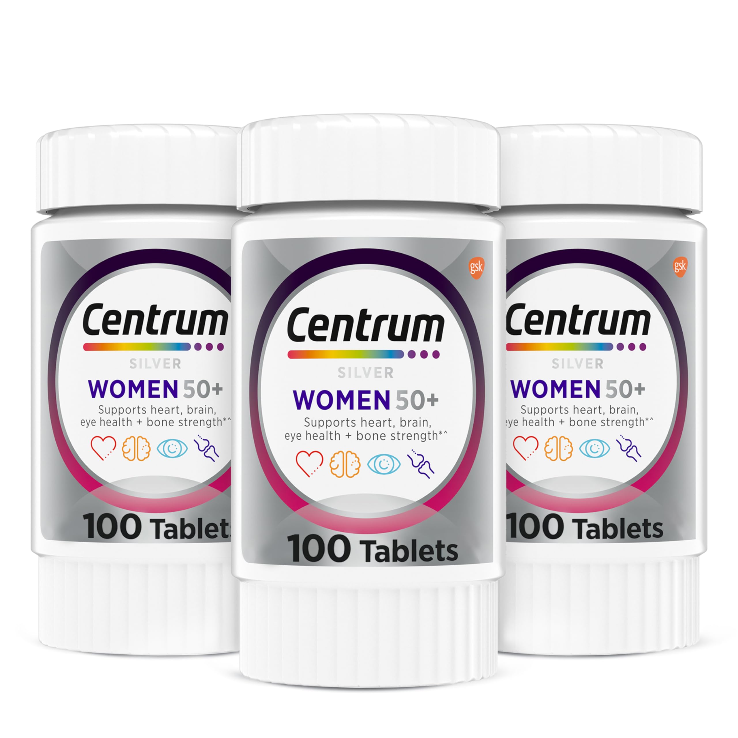 Take one of these multivitamins for women over 50 every day to provide nutrients to support a healthy body (1). Senior multivitamins for women that come in easy-to-swallow tablets. Multivitamins that are Non-GMO and gluten free (1, 3). Multivitamins for women 50 and over that help support immune health, bone health and muscle function with vitamin D (1). Multivitamin for women 50 plus that contains micronutrients such as B Vitamins, Vitamin D3 and Zinc that helps support full body wellness (1). Specially formulated women's multivitamins that support the heart, brain, eyes and overall health of women age 50 (1, 2). Three 100 count bottles of Centrum Silver Women's Multivitamin for Women 50 Plus, Multivitamin Multimineral Supplement with Vitamin D3, B Vitamins, Calcium and Antioxidant Vitamins C, E, and Beta-Carotene, and Zinc.