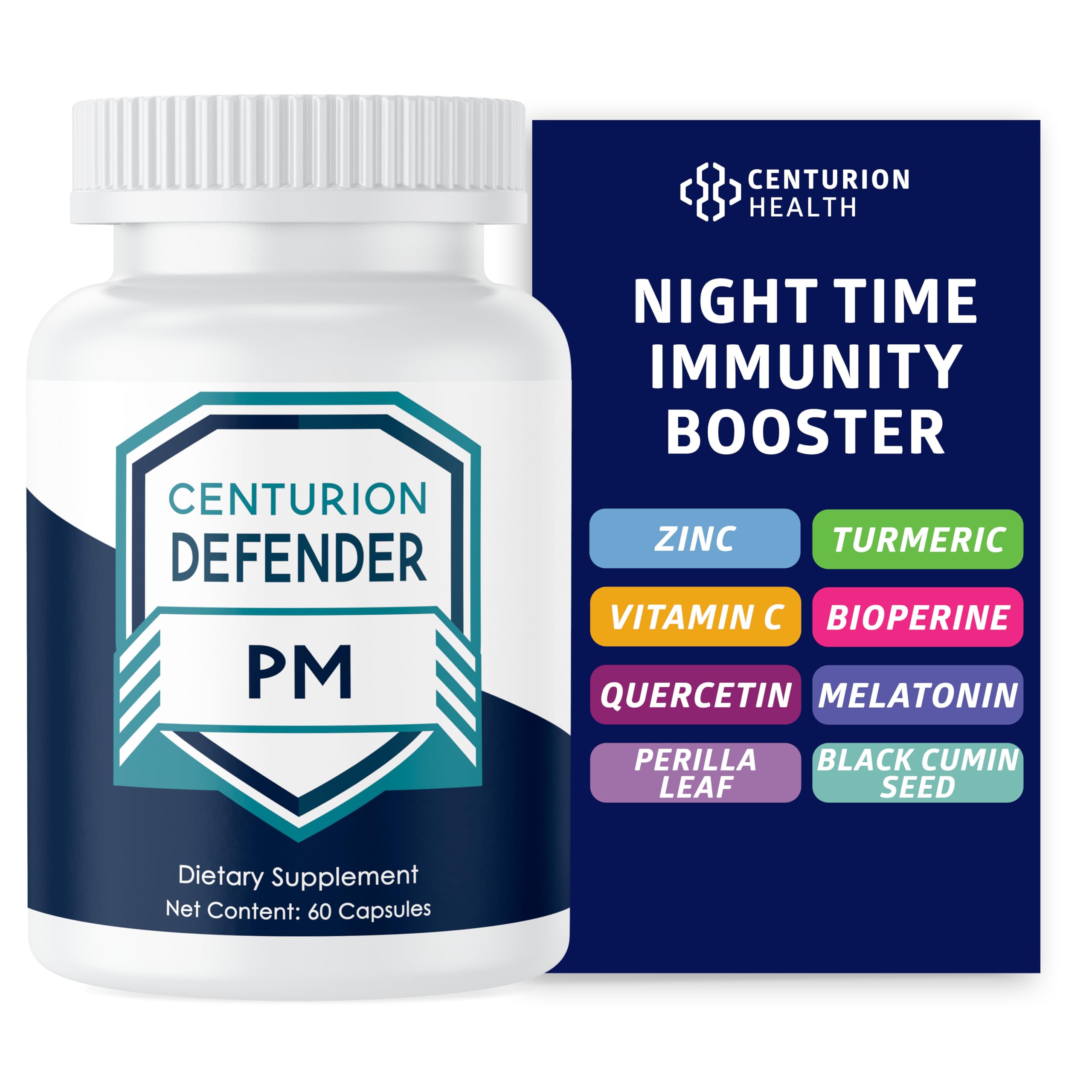 Centurion Defender PM 9-in-1 Natural Sleep + Immune Supplement for Recovery Immunity and Rest Support with Melatonin Quercetin Zinc Black Cumin Seed Perilla Leaf Extract and Vitamin C 60 Caps
