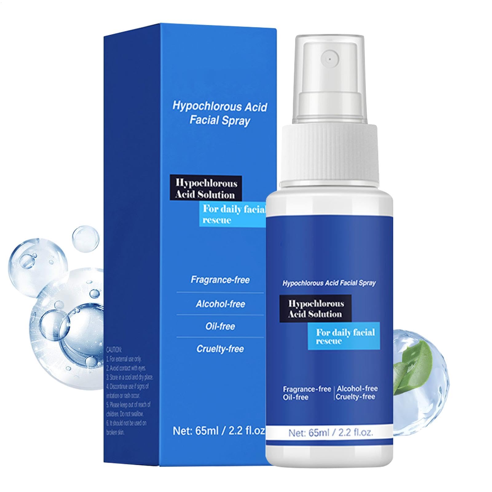 DESCRIPTION DU PRODUIT Our Face Spray Hypochlorous Acid will help relieve redness and irritation while fighting possible skin problems. Easily absorbed by the skin, it is perfect to fit in your bags and take it everywhere with you, especially during festivals. Specification: Net Content: 65ml Shelf Life: 3 Years Instruction: Apply to freshly cleansed skin in the morning or evening before using moisturizer and allow to air dry. Product List: 1 Hypochlorous Acid Spray Notes: Due to different lighting and screen settings, the product color may be slightly different from the picture. Due to the difference in manual measurement, please allow a 1-3cm difference in size.Comforting Relief: Enjoy a soothing effect with our Hypochlorous Acid Spray that can help alleviate discomfort, redness, and irritation with its fast-acting formula. Experience the calming and cooling sensation on your skin instantly. Modernized Skin Absorption: Adopting a fine mist nozzle design, the Hypochlorous Acid Spray ensures water mist is even, allowing for deep, easily absorbed application in any time of the day even in the night time. Powerful Skincare: Formulated as a skin-soothing accessory, this Hypochlorous Acid Spray is a must-have for fighting common skin problems. With its calming properties, it strengthens and protects the skin. Convenient to Carry: This Hypochlorous Acid Spray provides travel-sized skincare as it is small, light, and easily fits in bags. Keep your skin soothing and safe outdoors, without any space hassle in any time. Amazing Present: Give your loved person the present of a healthy home with our Hypochlorous Acid Spray. Perfect for festive occasions, birthdays, and events, this spray makes an excellent present choice.Women Hydrating Skin Liquids, Hypochlorous Acid Spray, Daily Rescue Facial Spray, Hydrating Face Care Spray for Sensitive Skin, Soothing Toner, 65ml, 3 Years Shelf LifeDESCRIPTION DU PRODUIT Our Face Spray Hypochlorous Acid will help relieve redness and irritation while fighting possible skin problems. Easily absorbed by the skin, it is perfect to fit in your bags and take it everywhere with you, especially during festivals. Specification: Net Content: 65ml Shelf Life: 3 Years Instruction: Apply to freshly cleansed skin in the morning or evening before using moisturizer and allow to air dry. Product List: 1 Hypochlorous Acid Spray Notes: Due to different lighting and screen settings, the product color may be slightly different from the picture. Due to the difference in manual measurement, please allow a 1-3cm difference in size.Comforting Relief: Enjoy a soothing effect with our Hypochlorous Acid Spray that can help alleviate discomfort, redness, and irritation with its fast-acting formula. Experience the calming and cooling sensation on your skin instantly. Modernized Skin Absorption: Adopting a fine mist nozzle design, the Hypochlorous Acid Spray ensures water mist is even, allowing for deep, easily absorbed application in any time of the day even in the night time. Powerful Skincare: Formulated as a skin-soothing accessory, this Hypochlorous Acid Spray is a must-have for fighting common skin problems. With its calming properties, it strengthens and protects the skin. Convenient to Carry: This Hypochlorous Acid Spray provides travel-sized skincare as it is small, light, and easily fits in bags. Keep your skin soothing and safe outdoors, without any space hassle in any time. Amazing Present: Give your loved person the present of a healthy home with our Hypochlorous Acid Spray. Perfect for festive occasions, birthdays, and events, this spray makes an excellent present choice.