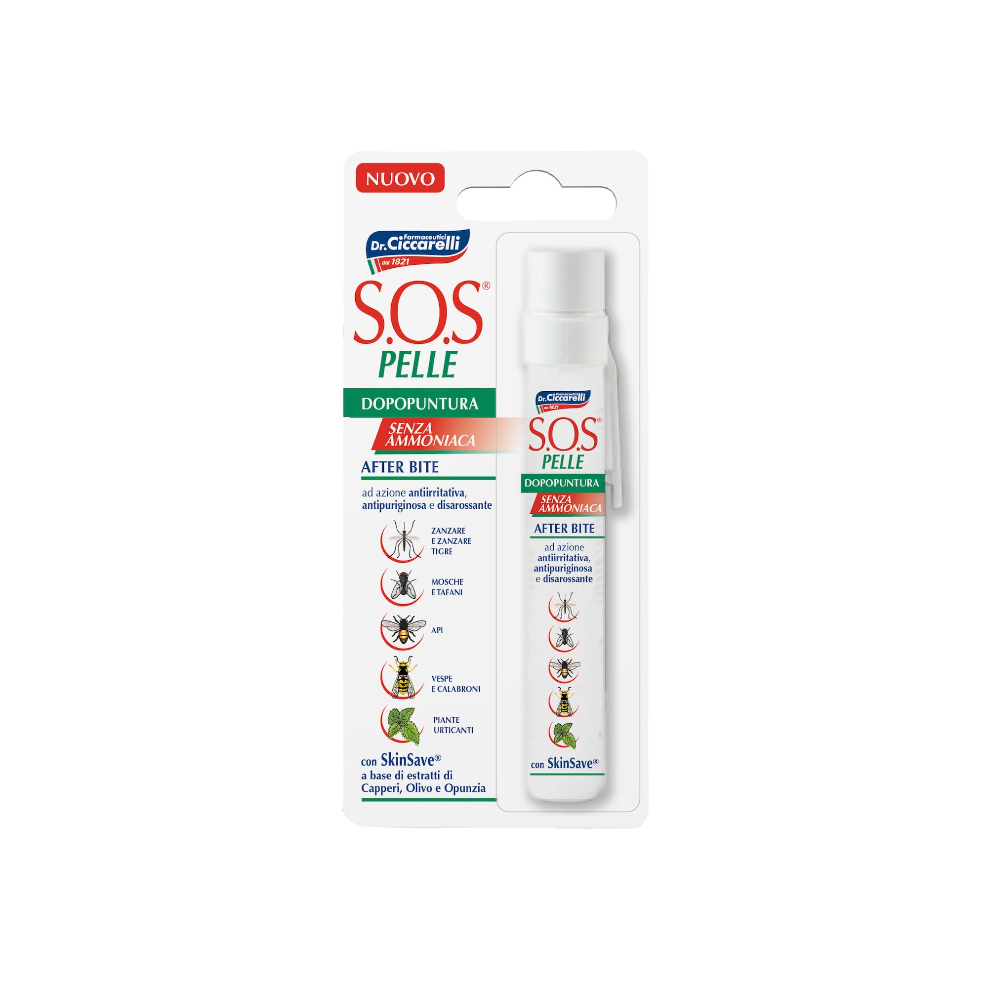 S.O.S Dopuntura pen is the practical solution to take with you in any situation, ideal for quickly and effectively relieving and soothing itching and redness of the skin, due to stings, tigress, moss, tafani, bees, vespas, calabroni and battle plants. It is a liquid gel, which has the properties of skinsave, a complex of natural active substances, which are made from butter, olive oil and opuncia extract. The effect of skinsave is known by the presence of chlorinated aluminum, which is known for its anti-abrasive and anti-abrasive properties. INGREDIENTS Aqua, Alcohol Denate, Aluminum Chloride, Glycerin, Maltodextrin, Hydroxyethyl CELLULOSE, Caparis Spinosa Extract, Olea Europea Leaf Extract, Optia Coccinellifera ExtractDr. CICCARELLI - Ciccarelli products come directly from the production facilities at our headquarters in Milan. A real industrial factory with the most modern machines that participate in the different stages of the production of our products. Innovation: The continuous research and introduction of active ingredients and targeted active ingredients has allowed the development of specific formulations that can respond to all types of needs. An innovative approach that Dr. Ciccarelli, which aims to achieve the best results, backing promises and guaranteeing the performance of the individual products. S.O.S DOPOPUNTURA SKIN - The S.O.S Dr. Ciccarelli line offers a range of products based on natural ingredients to respond gently yet effectively to the specific needs of the skin. SOS skin pender is a practical and comfortable solution to quickly soothe and soothe itching and skin irritation caused by insect bites and plants. Use: shake well before use. Place the applicator with the pen on the area affected by the puncture. Apply several times if necessary. Immediate use guarantees maximum effectiveness. Do not bandage and or dab until the product is thoroughly dry and leaves a light film. Contents - At home you will receive an S.O.S Dr Ciccarelli 15 ml after point. It is the practical solution that you can take anywhere, ideal for quickly and effectively soothing and calming itching and skin irritation caused by mosquito bites, tiger mosquitoes, flies, taani, bees, wasps, hornets and nettle plants. Works by using the properties of skinsave, a complex of natural active substances from capers, olive leaves and punishment.S.O.S Dr Ciccarelli, napunctuurstift, kalmeert effectief jeuk en irritatie van de huid, veroorzaakt door muggen, bijen, wespen, 100 Made in Italy, dermatologisch getest, pen 15 ml S.O.S Dopuntura pen is de praktische oplossing om in elke situatie mee te nemen, ideaal voor het snel en effectief verlichten en kalmeren van jeuk en roodheid van de huid, als gevolg van stestestestestesteken, tijgerantjes, mos, tafani, bijen, vespas, calabroni en slagplanten. Het is een vloeibare gel, die de eigenschappen van skinsave, een complex van natuurlijke werkzame stoffen, die uit boters, olijfolie en opuncia extract zijn. De werking van skinsave wordt bekend door de aanwezigheid van chloor aluminium, dat bekend staat om zijn anti-schurend en afdringing. INGREDIËNTEN Aqua, alcohol-denaat, aluminiumchloride, glycerine, maltodextrine, hydroxyethyLCELLULOSE, Caparis Spinosa Extract, Olea Europea Leaf Extract, Optia Coccinellifera ExtractDr. CICCARELLI - De producten Ciccarelli komen rechtstreeks uit de productiefaciliteiten in ons hoofdkantoor in Milaan. Een echte industriële fabriek met de modernste machines die deelnemen aan de verschillende fasen van de productie van onze producten. Innovatie: het voortdurend onderzoek en de introductie van werkzame stoffen en gerichte werkzame stoffen heeft de ontwikkeling van specifieke formuleringen mogelijk gemaakt die op alle soorten behoeften kunnen inspelen. Een innovatieve benadering die de nieuwe formules van Dr. Ciccarelli, die tot doel heeft de beste resultaten te bereiken, beloften te ondersteunen en de prestaties van de afzonderlijke producten te garanderen. S.O.S DOPOPUNTURA HUID - De S.O.S Dr. Ciccarelli lijn biedt een reeks producten op basis van natuurlijke ingrediënten om zacht en toch effectief te reageren op de specifieke behoeften van de huid. SOS huidpender is een praktische en comfortabele oplossing om jeuk en huidirritatie door insectenbeten en planten snel te kalmeren en te kalmeren. Gebruik: goed schudden voor gebruik. Plaats de applicator met de pen op de plaats die door de punctie is aangetast. Indien nodig meerdere keren aanbrengen. Onmiddellijk gebruik garandeert maximale werkzaamheid. Ververband en of dep niet tot het product goed droog is en een lichte film achterlaat. Inhoud - Thuis krijg je een S.O.S Dr Ciccarelli 15 ml na punt. Het is de praktische oplossing die je overal mee naartoe kunt nemen, ideaal voor het snel en effectief kalmeren en kalmeren van jeuk en huidirritatie door muggenbeten, tijgermuggen, vliegen, taani, bijen, wespen, horzels en netelplanten. Werkt door het gebruik van de eigenschappen van skinsave, een complex van natuurlijke werkzame stoffen uit kappertjes, olijfbladeren en straf.