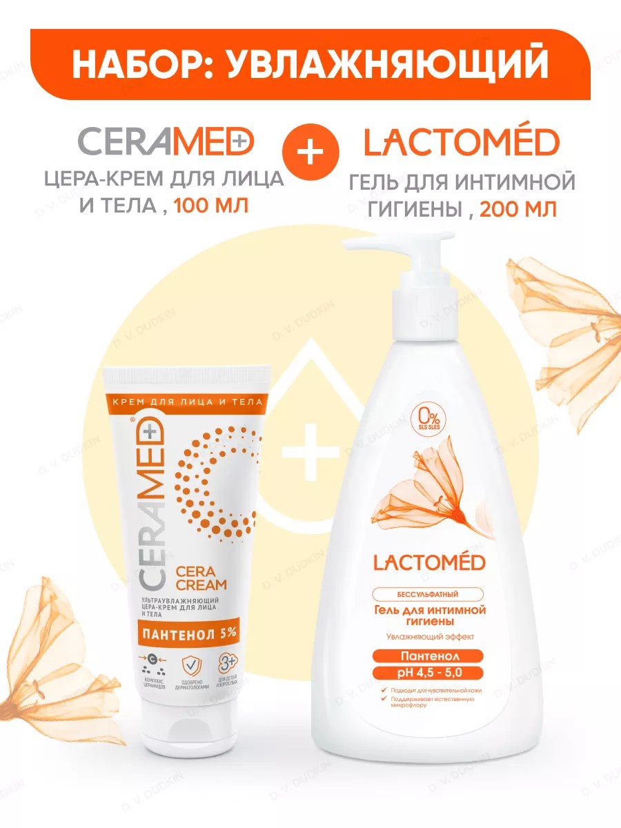 Set: Moisturizing Cera-Cream for face and body, 100 ml + Lactomed Intimate Hygiene Gel, 200 ml. Cera-Cream, thanks to a rich formula with a complex of ceramides and oils, restores the hydrolipid balance, improves the skin's protective function, and nourishes. Recommended for sunburn and other skin damage. D-panthenol has anti-inflammatory and restorative properties. Does not contain parabens, dyes, or alcohol. HOW TO USE: Apply the required amount of cream to areas of skin experiencing discomfort and dryness. Avoid the eye area and mucous membranes. Recommended for application twice a day, morning and evening. Sulfate-free Lactomed intimate hygiene gel with panthenol and chamomile extract is designed for gentle cleansing and delicate care of sensitive skin. This intimate bath and shower gel supports natural microflora, provides antibacterial and soothing properties, and is gentle on the skin. Its active ingredients maintain natural hydration, soothe, and soften the skin. Recommended by gynecologists for daily care of women's intimate areas. Its safe formula is suitable for all skin types. Laktomed women's intimate shower gel creates a long-lasting feeling of freshness and comfort throughout the day, maintaining the natural balance of the intimate area. All formulas have undergone clinical trials, confirming the effectiveness and safety of the products.
