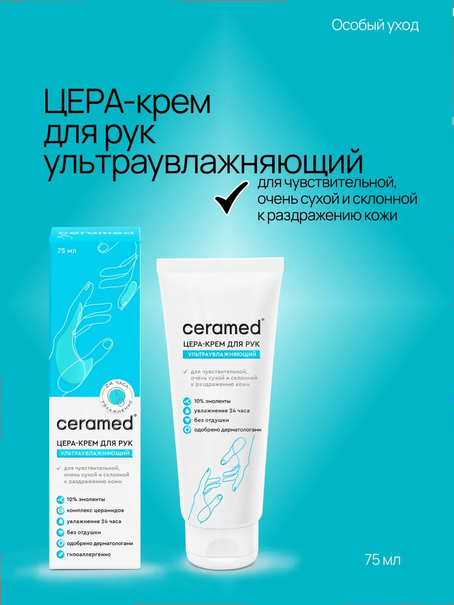 Цера-крем для рук глубоко увлажняет кожу, проникая в глубокие слои эпидермиса. Благодаря насыщенной формуле с комплексом церамидов и эмолентами, цера-крем нормализует естественный микробиом кожи, восстанавливает гидролипидный баланс, улучшает защитную функцию кожи. Активные компоненты крема смягчают кожу, насыщают ее питательными элементами, обеспечивают эффективное увлажнение в течение 24 часов. Мягкая текстура крема быстро впитывается, не оставляет липкой пленки. Инновационная формула восстанавливает сухую и поврежденную кожу, надолго сохраняя красоту и молодость рук.Основной действующий компонент: масло семян какао, масло оливы. CERAMED: скажите СТОП сухой коже! Цера-косметика для чувствительной, очень сухой и склонной к раздражению кожи. Продукция Ceramed, разработанная на основе комплекса церамидов, восстанавливают естественный уровень увлажнения кожи изнутри. Благодаря этому кожа всегда выглядит ухоженной.Кремы на основе церамидов восстанавливают естественный уровень увлажнения кожи изнутри и благодаря этому она всегда выглядит ухоженной! Разрабатывая Ceramed, наши технологи уделяли внимание известным мировым брендам косметической продукции таким как Cerave. ЦЕРАМИДЫ - это ключевые структурные элементы рогового слоя. Недостаток церамидов в кожи помогает восполнить косметика с церамидами.Продукты CERAMED не маскируют проблемы кожи, а восстанавливают гидро-липидный баланс кожи, уменьшают сухость. Все продукты одобрены дерматологами и гипоаллергенны (Клинически доказано Медицинским центром ООО «НПЦ»КосмоПродТест»).CERAMED имеет безопасный состав: отсутствуют парабены, SLS, SLES, красители – это важно для людей с сухой кожей.Для чувствительной, очень сухой и склонной к раздражению кожи.Индивидуальный подход к каждой части тела.Все заявленные свойства одобрены и рекомендованы дерматологами.Выбор компонентов по принципу биосинергии.без парабенов ⭑ без красителей ⭑ без спирта ⭑ без силиконов