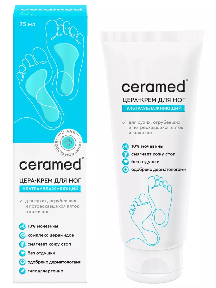 Цера-Крем тройного действия для ног ультраувлажняющий — идеальное средство для ухода за кожей ног. Благодаря своей уникальной формуле и активным компонентам, крем Церамед эффективно увлажняет и смягчает кожу, устраняет трещины и натоптыши, делая ее мягкой и гладкой. Регулярное использование крема поможет сохранить здоровье кожи ног и предотвратить появление сухости и раздражения. Нежная текстура крема быстро впитывается и оставляет ощущение комфорта на весь день. Кожа ног чаще всего подвержена сухости, поскольку там меньше всего сальных желез. Постоянные нагрузки на ноги влияют на избыточное ороговение кожи стоп. Свойства. Способствует устранению трещин и натоптышей. Увлажняет и смягчает. Смягчает огрубевшую кожу.