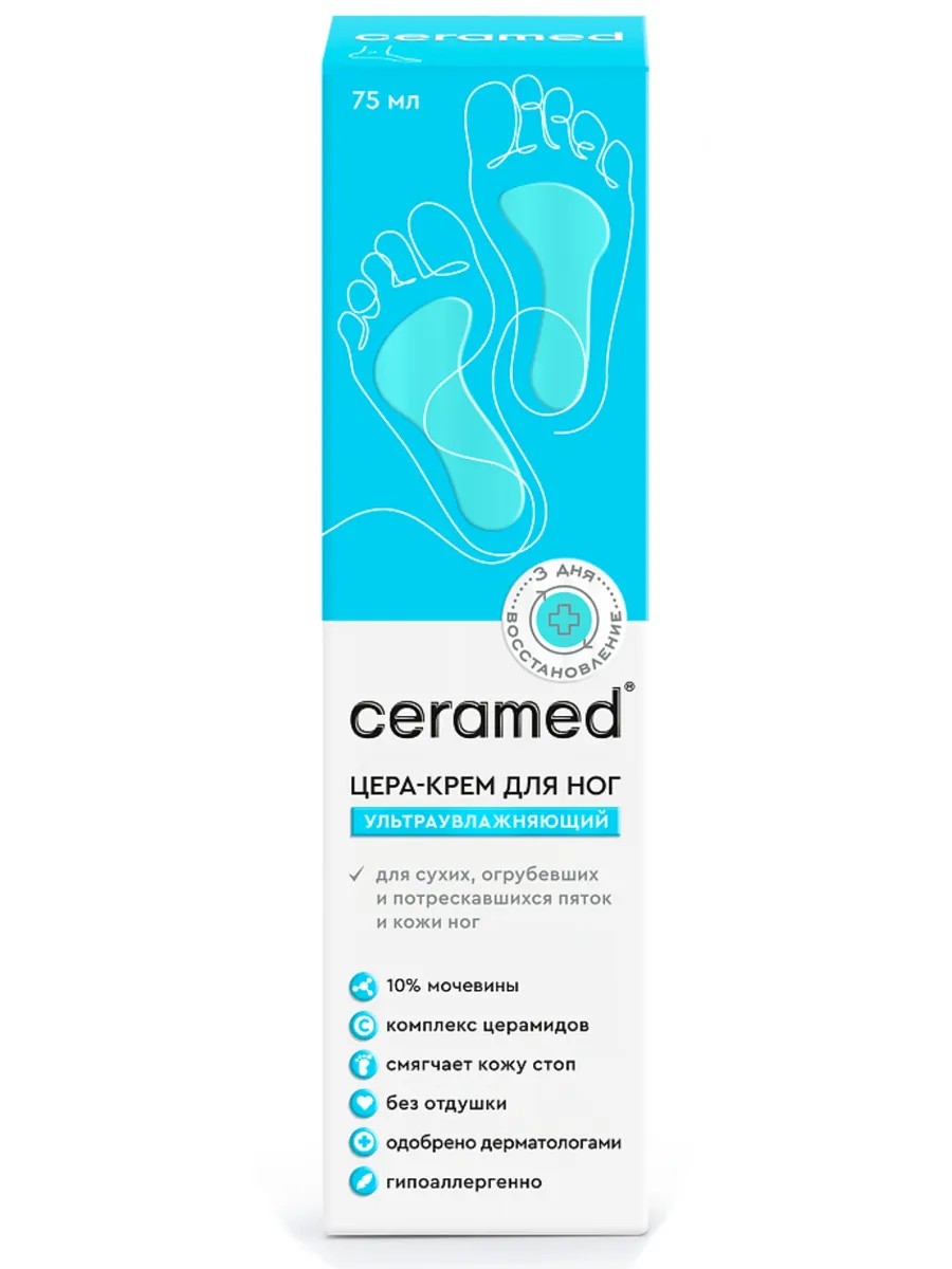 The skin of the feet is often prone to dryness. Constant stress causes excessive keratinization of the skin on the feet. Therefore, foot care is an important daily procedure. The cream formula promotes deep hydration and softening of dry and cracked skin. Cera-cream is ideal for sensitive, dry, and irritated skin of the feet. Moisturizing the skin at home is the most effective method of foot care. Ceramides are key structural elements of the stratum corneum. When the skin is damaged, they fill the intercellular space and reduce transepidermal water loss. Urea promotes exfoliation of keratinized cells, creating a keratolytic effect; the skin is freed from dead cells and renewed. It has hygroscopic properties, increasing the level of hydration in the epidermis. Sensitive skin care should be regular. Urea content - 10%. Softens calluses. Directions for use: Apply the cream to the skin of the legs and feet. Distribute with massaging movements.