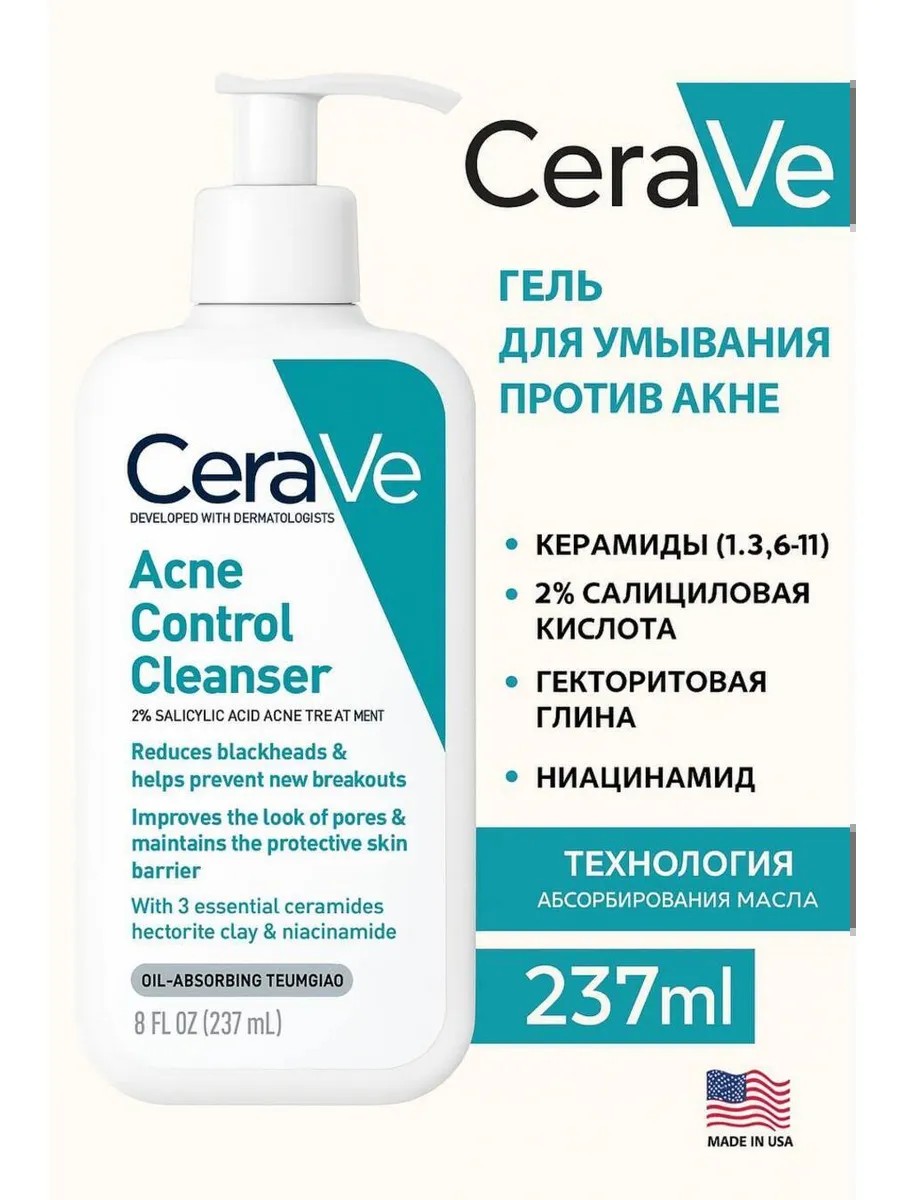 Для достижения наилучших результатов, очищайте кожу утром и вечером, а затем наносите гель CeraVe Acne Control на все лицо. Этот продукт представлен в виде прозрачного геля, который при вспенивании превращается в лёгкое пенящееся средство для умывания. Он бережно очищает, разглаживает и увлажняет кожу, не оставляя ощущения стянутости.