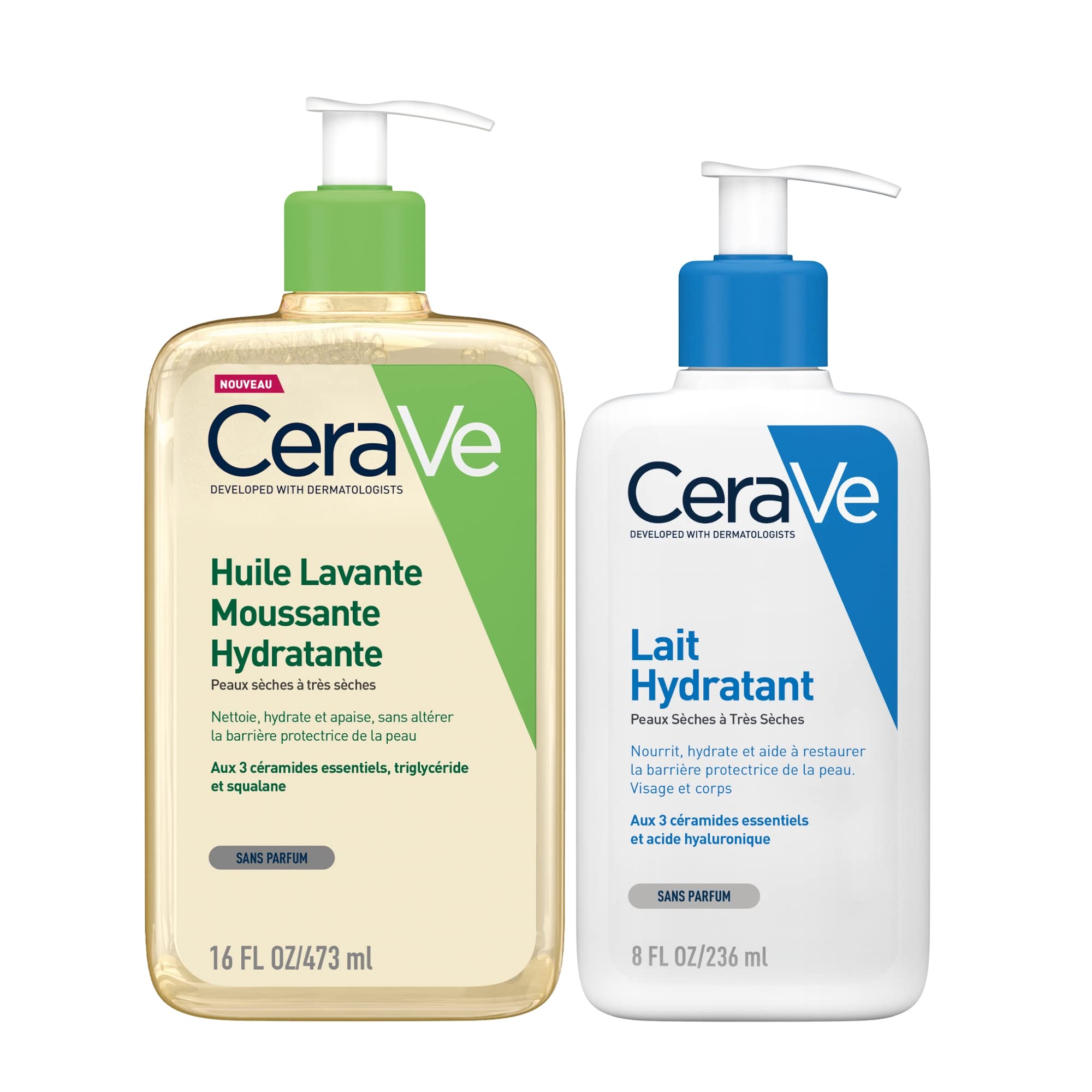 CeraVe Huile de Douche Lavante à l'Acide Hyaluronique pour Peaux Normales à Très Sèches, à Tendance Atopique 473 ml CeraVe Lait Crème Hydratante pour Corps Visage 24h Nourrissante