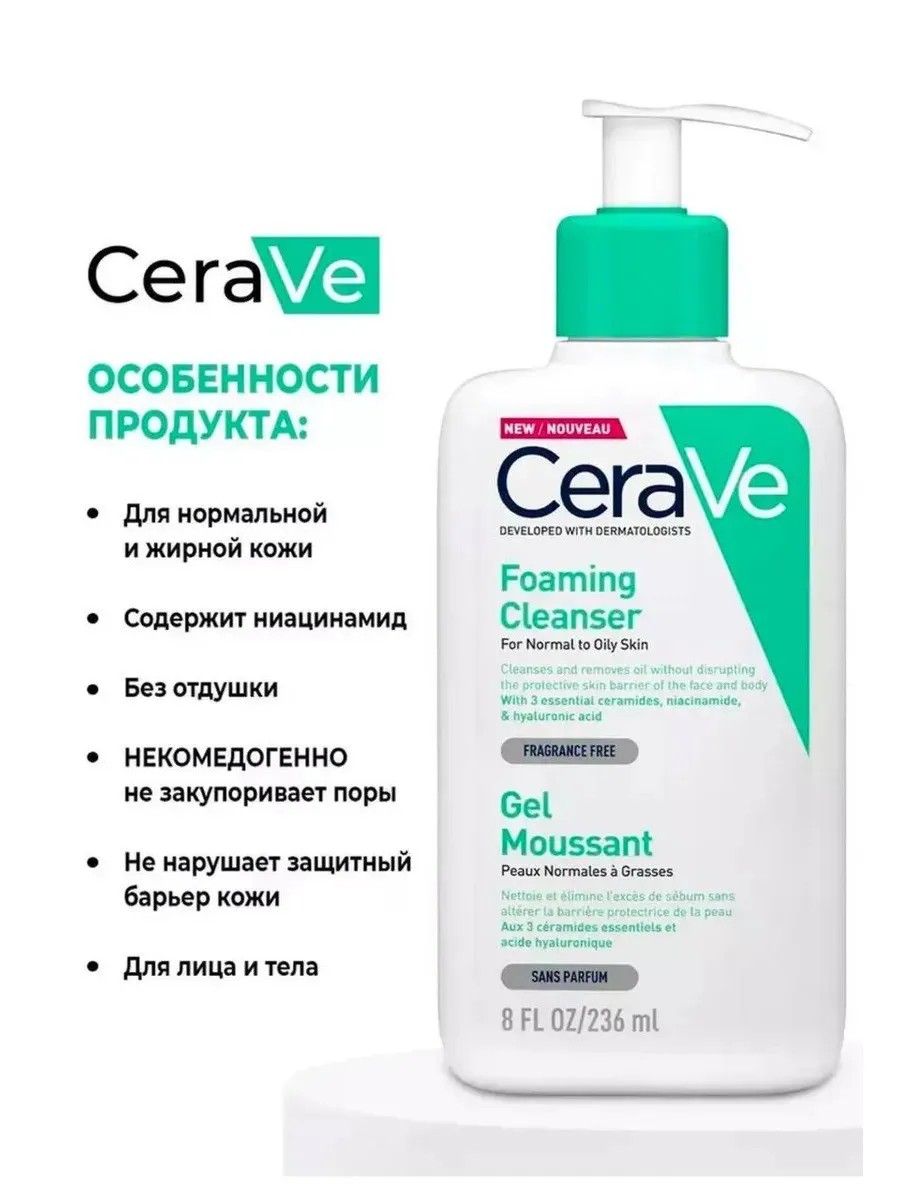 При выборе средства для умывания для нормальной и жирной кожи важно искать формулу, которая будет глубоко очищать, не нарушая естественный барьер влаги вашей кожи. CeraVe Foaming Facial Cleanser содержит керамиды , гиалуроновую кислоту и ниацинамид и помогает поддерживать защитный барьер кожи, удерживать влагу и успокаивать кожу. Разработанное совместно с дерматологами, это средство для умывания без высыхания для нормальной и жирной кожи глубоко очищает, удаляет излишки жира и освежает кожу, не нарушая кожный барьер. Это очищающее средство для лица на основе геля является эффективным, но щадящим способом очищения и ухода за нормальной и жирной кожей. Пенка содержит только мягкие безопасные ПАВы, которые создают пышную воздушную пену и эффективно очищает кожу от загрязнений, удаляют следы макияжа и освежают кожу. Пенка интенсивно увлажняет, предотвращая пересушивание, делает кожу гладкой и мягкой.