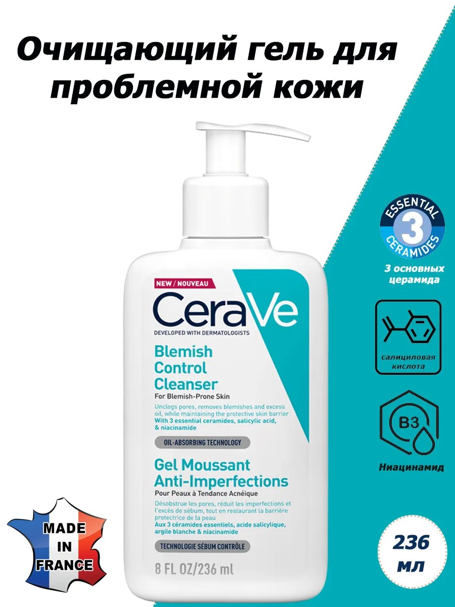В поисках идеального очищающего средства для проблемной кожи? Обратите внимание на уникальный гель, созданный специально для решения ваших проблем. Этот освежающий гель-очиститель для лица, произведенный во Франции, идеально подходит для кожи, склонной к появлению пятен и черных точек.Формула геля проникает глубоко в поры, устраняя причины возникновения несовершенств, при этом бережно заботится о естественном барьере кожи. С помощью линейки CeraVe Blemish Control вы сможете взять под контроль состояние своей кожи и предотвратить появление новых проблем. Гель Сераве эффективно удаляет грязь, примеси и излишки жира, не лишая кожу необходимой влаги. Его мягкая формула помогает уменьшить видимость черных точек и пятен, а также аккуратно отшелушивает омертвевшие клетки кожи, которые могут забивать поры. Благодаря технологии поглощения масла, вы сможете забыть о нежелательном блеске и наслаждаться комфортной, свежей и здоровой кожей.Активные компоненты, такие как салициловая кислота, ниацинамид и минеральная глина, делают этот продукт незаменимым в вашем уходе за кожей. Ниацинамид уменьшает воспаления и делает несовершенства менее заметными, в то время как керамиды восстанавливают и укрепляют защитный слой кожи, помогая ей удерживать влагу и защищаться от внешних раздражителей. 2% BHA салициловая кислота эффективно очищает поры и удаляет мертвые клетки, предотвращая их блокировку. Минеральная глина активно поглощает лишний себум, обеспечивая матирующий эффект. аккуратно нанесите его на кожу круговыми движениями и тщательно смойте водой. Не забудьте избегать области вокруг глаз, а в случае попадания в глаза немедленно промойте их большим количеством воды. Гель Цераве идеально подходит для проблемной, жирной и комбинированной кожи. Он является частью аптечной и дерматокосметики, что гарантирует его высокое качество и эффективность. Откройте для себя французскую косметику, которая действительно работает, и позвольте вашей коже засиять здоровьем и красотой!
