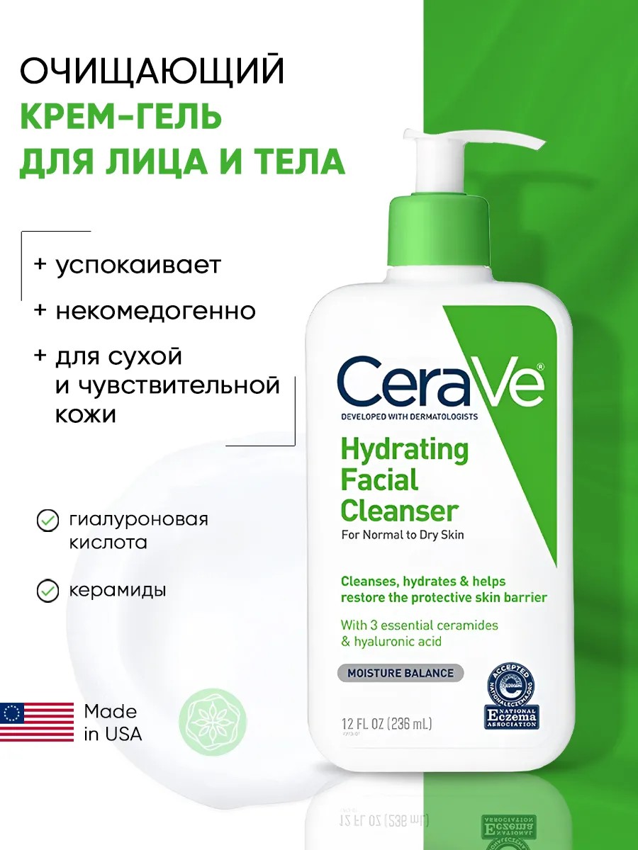 Крем гель для лица и тела CeraVe Hydrating Facial Cleanser увлажняющий является эффективным, многофункциональным средством в косметологии по уходу за сухой и нормальной кожей, идеально очищает и увлажняет ее, придавая ей упругость, уменьшая морщины, облегчая воспаление, придавая нежирный блеск. В состав очищающего средства входит аква вода, которая позволяет снизить агрессивность и токсичность некоторых компонентов, растворяя их. Присутствие в восстанавливающей косметике гиалуроната натрия решение ряда проблем, вызванных недостатком влаги в кожном покрове людей всех возрастов. Проникая невероятно глубоко в кожу, он вытягивает воду из воздуха, помогает удерживать влагу, сохраняя ее увлажненной и без шелушений. Уникальность состава умывалки с кислотами керави состоит в трех видах керамидов, из которых строится природная защита. Керамиды скрепляют клеточные структуры, стимулируя выработку коллагена, повышая упругость, образуют пленку, не пропускающую УФ излучение, пыль, бактерий, отслеживают цикл развития клеток. Смягчающая умывашка церави подходит для нежного удаления макияжа, грязи, делая кожу бархатистой.