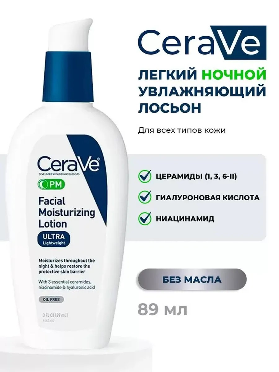 Увлажняющий лосьон для лица PM CeraVe PM Facial Moisturizing Lotion, 89 мл. БЕЗМАСЛЯНЫЙ. Легкий ночной крем с ниацинамидом. Даже если ваша кожа жирная, она нуждается в увлажнении круглосуточно. Ей могут понадобиться и другие ингредиенты например, успокаивающие, более мягкая текстура и помощь в восстановлении естественного барьера увлажнения. Включение насыщенного, но легкого ночного крема, в ваш ночной уход за кожей может обеспечить все эти преимущества и даже больше. Разработанный совместно с дерматологами, увлажняющий крем для лица предназначен для удержания влаги в вашей коже и помогает восстановить естественный барьер кожи во время сна. Добавление этого безмасляного, не комедогенного ночного крема к вашему ежедневному уходу за кожей поможет увлажнить, успокоить и смягчить вашу кожу, а также поможет сохранить защитный кожный барьер. Этот ночной крем, содержащий ниацинамид, гиалуроновую кислоту и три незаменимых керамида, использует нашу технологию MVE для обеспечения постоянного притока столь необходимой влаги в течение всей ночи и предлагает эффективный, но нежный способ ухода за нормальной и жирной кожей.