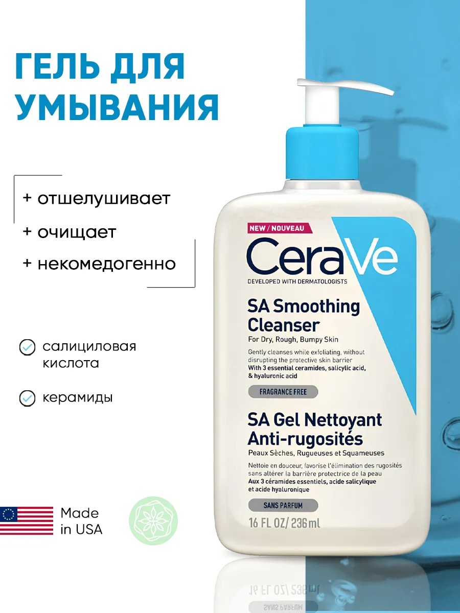 Гель для умывания лица и тела Cerave SA Smoothing Cleanser специально разработанная формула для профессионального ухода за сухой, огрубевшей, проблемной, неровной кожей. В состав смягчающей, очищающей умывалки входит салициловая кислота, которая благодаря своим антисептическим и бактерицидным свойствам подавляет воспалительные процессы, глубоко очищает поры, деликатно отшелушивает неровную кожу, придает ей свежую, светлую текстуру, ускоряет процесс обновления, снижает излишнюю жирность, борется со старением и улучшает кровообращение. Уникальность увлажняющего, средства кераве для умывания состоит в трех видах керамидов, из которых строится природная защита кожи. Они восстанавливают баланс, увлажняют, придают упругость, не вызывают шелушения и сухости. Разглаживающий, кислотный гель пенка цераве без сульфатов, отдушек, содержит только натуральные компоненты, гипоаллергенен, и подходит для ежедневного бьюти ритуала утром и вечером женщинам, мужчинам, подросткам, делая кожу ухоженной, гладкой и бархатистой.