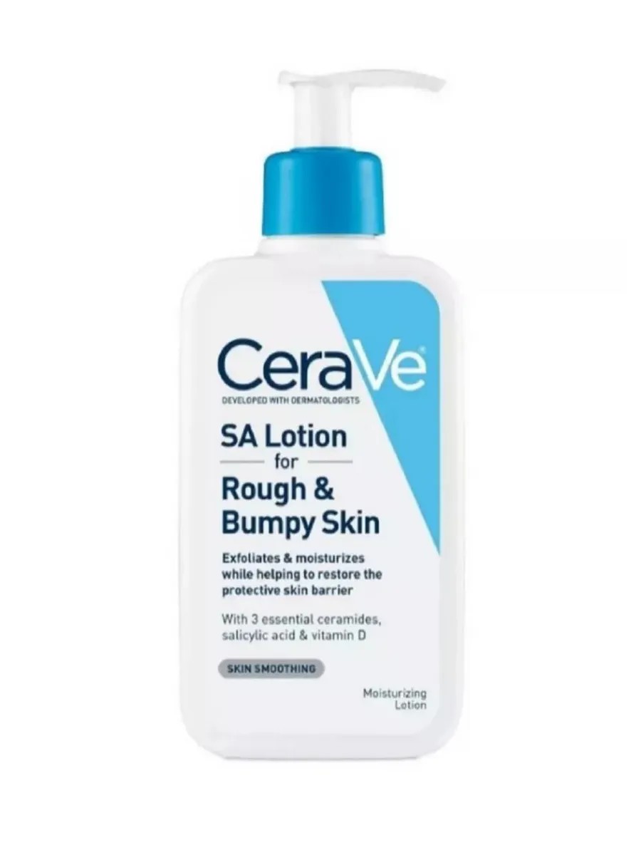 SA Lotion for Rough & Bumpy Skin - лосьон для грубой и неровной кожи. Отшелушивающий гель для умывания CeraVe с салициловой кислотой разглаживает и смягчает сухую кожу ног, локтей, коленей и других проблемных зон. Лосьон содержит салициловую и молочную кислоты для мягкого отшелушивания, а также увлажняющую гиалуроновую кислоту и керамиды для восстановления естественного барьера кожи.