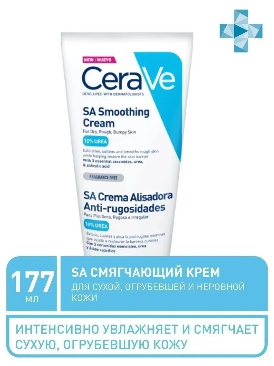 Cerave SA Smoothing Cream. A cream for softening dry, rough, and uneven skin. Formulated with 10% urea, which intensely hydrates and retains moisture, and a complex of salicylic acid and lipohydroxy acid, it helps effectively exfoliate rough skin. 3 essential ceramides help restore and strengthen the skin's protective barrier. To keep skin hydrated throughout the day, the cream contains patented MVE technology, which ensures the sequential release of ingredients and long-lasting hydration. Hypoallergenic. Suitable for sensitive skin. HOW TO USE: Apply to cleansed skin. Massage the required amount of cream into the skin. In case of contact with eyes, rinse immediately with plenty of water.