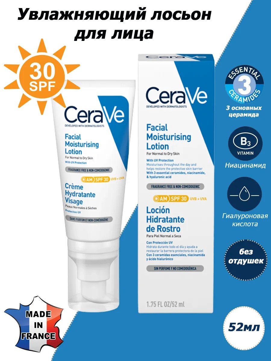 CeraVe Увлажняющий лосьон для лица с SPF30: защита и уход в одном флаконе.Каждый день ваша кожа сталкивается с негативными воздействиями окружающей среды, а солнце — один из главных врагов. Поэтому важно выбирать правильные средства для ухода. CeraVe Увлажняющий лосьон для лица с SPF30 — это идеальное решение для тех, кто хочет защитить свою кожу и обеспечить ей необходимое увлажнение.Произведенный во Франции, этот легкий увлажняющий крем сочетает в себе высокоэффективную формулу, разработанную совместно с дерматологами. С SPF30 вы получаете надежную защиту от вредных UVA и UVB-лучей, что делает его незаменимым элементом вашего утреннего ухода. Наносите его ежедневно, и ваша кожа будет не только защищена, но и увлажнена на целых 24 часа.Ключевыми компонентами этого продукта являются гиалуроновая кислота и три основных церамида. Гиалуроновая кислота известна своей способностью удерживать влагу, обеспечивая интенсивное увлажнение, а церамиды способствуют восстановлению естественного барьера кожи. Это значит, что ваша кожа станет более упругой и здоровой, а также будет защищена от потери влаги.Легкая формула CeraVe не оставляет жирного блеска и белого налета, что делает его идеальным для всех типов кожи, включая чувствительную. Он некомедогенен, что означает, что не забивает поры, и подходит для ежедневного использования. Просто нанесите его на очищенную кожу лица и шеи, избегая области вокруг глаз, и наслаждайтесь свежестью и комфортом в течение всего дня.Этот увлажняющий лосьон станет отличным подарком на день рождения для ваших близких, ведь он объединяет в себе уход и защиту. Французская косметика Сераве уже завоевала доверие многих пользователей благодаря своей эффективности и высокому качеству.Не упустите возможность обеспечить своей коже надежную защиту и увлажнение с Цераве Увлажняющим лосьоном для лица с SPF30. Закажите его прямо сейчас и позвольте своей коже сиять здоровьем и красотой! spf для лица. солнцезащитное средство.Французская косметика.