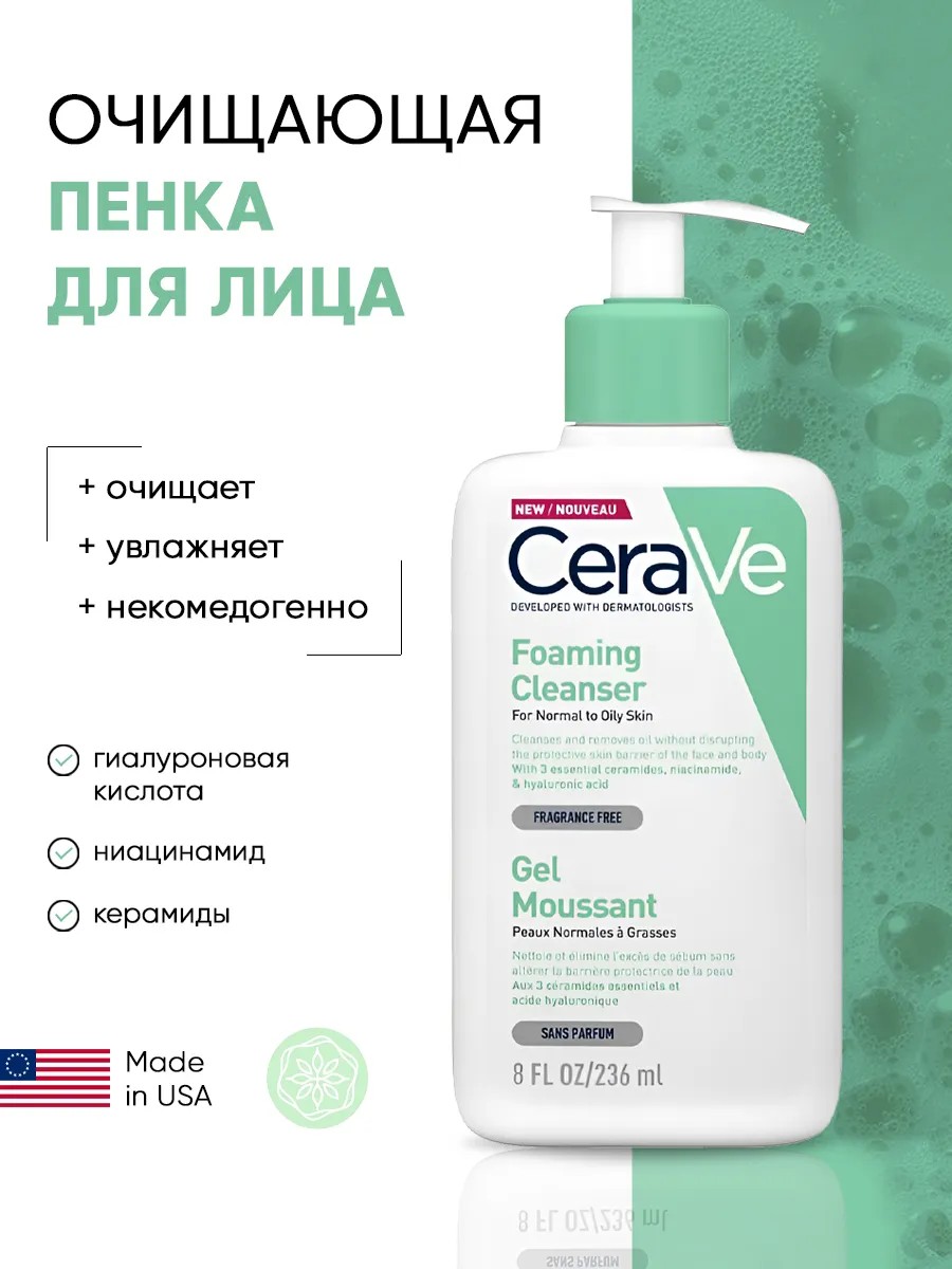 Гель для умывания лица и тела Cerave Foaming Cleanser специально разработанная формула для профессионального ухода за жирной и нормальной кожей. В состав многофункциональной, очищающей умывалки входит гиалуроновая кислота, которая решает ряд проблем, вызванных недостатком влаги в кожном покрове людей всех возрастов. Проникая невероятно глубоко в кожу, она вытягивает воду из воздуха, помогает удерживать влагу, сохраняя ее увлажненной, глубоко очищает поры, способствует удалению ороговевших клеток, придает свежую, светлую текстуру, ускоряет процесс обновления, снижает излишнюю жирность, борется со старением и улучшает кровообращение. Пенящаяся умывашка Cera ve аптечное средство для борьбы и предотвращения появления прыщей, комедонов, черных точек. Уникальность увлажняющего, смягчающего средства кераве для умывания состоит в трех видах керамидов, из которых строится природная защита кожи. Они восстанавливают баланс, увлажняют, придают упругость, не вызывают шелушения и сухости. Кислотный гель пенка цераве гипоаллергенен, содержит только натуральные компоненты, без сульфатов, не содержит отдушек, и подходит для ежедневного ухода утром и вечером женщинам, мужчинам, подросткам.