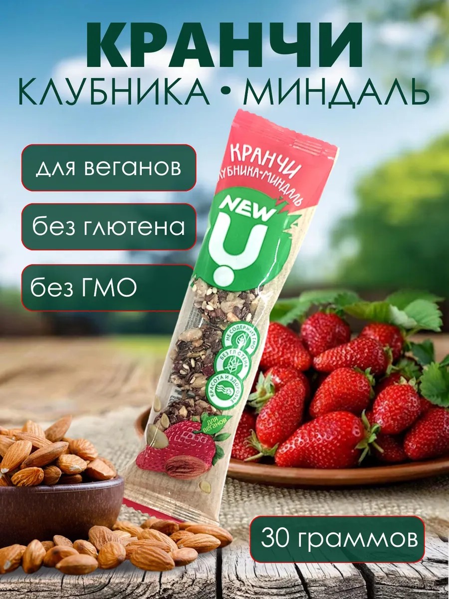 Кранчи NEW U "Клубника-миндаль" – это инновационный ЗОЖ продукт – необычный порционный снек, в форме «шайбочек», который состоит из орехов, фруктов, ягод и злаков на патоке. Кранчи NEW U – это вечный двигатель тех, кто преодолевает себя на пути к своим целям и идеалам. Это крутой поворот. Новый взгляд на то, что вы едите. С минимальным содержанием сахара. Без животных жиров. Не содержит ГМО, сою, глютен, красителей и консервантов.