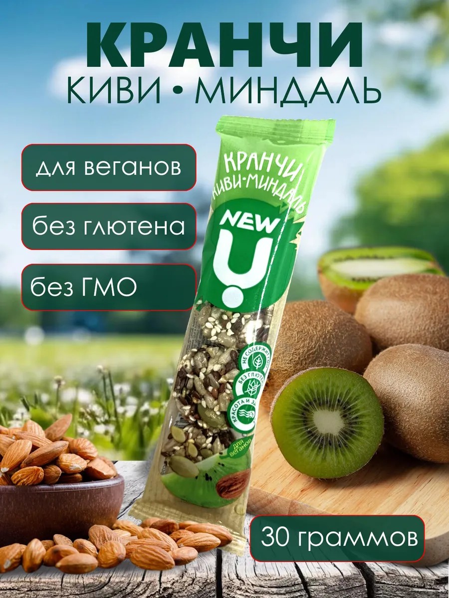 NEW U "Kiwi-Almond" Crunchies are an innovative healthy lifestyle product – an unusual portioned snack in the form of "pucks" made of nuts, fruits, berries, and cereals in molasses. NEW U Crunchies are the perpetual motion machine of those who overcome themselves on the path to their goals and ideals. This is a cool twist.