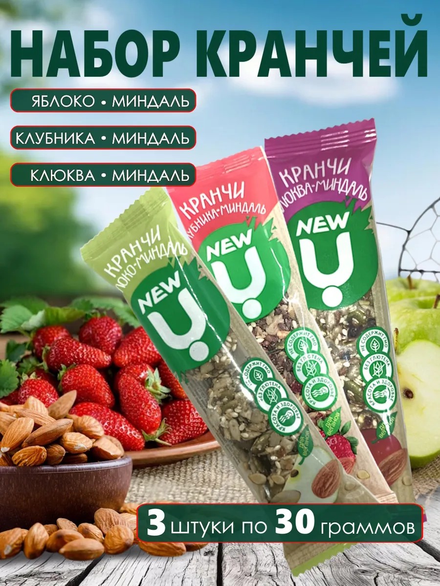 Кранчи NEW U – это инновационный ЗОЖ продукт – необычный порционный снек, в форме «шайбочек», который состоит из орехов, фруктов, ягод и злаков на патоке. Кранчи NEW U – это вечный двигатель тех, кто преодолевает себя на пути к своим целям и идеалам. Это крутой поворот. Новый взгляд на то, что вы едите. С минимальным содержанием сахара. Без животных жиров. Не содержит ГМО, сою, глютен, красителей и консервантов.