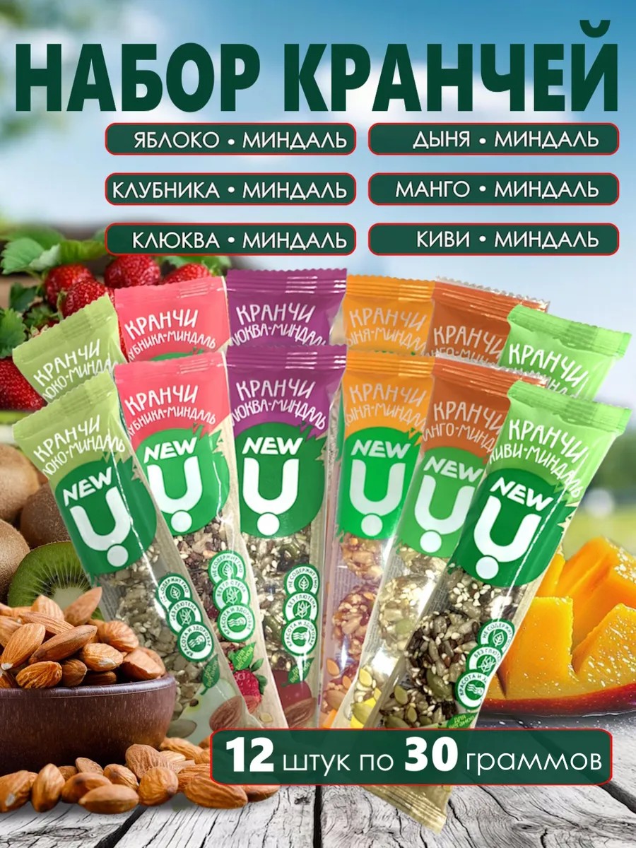 Кранчи NEW U – это инновационный ЗОЖ продукт – необычный порционный снек, в форме «шайбочек», который состоит из орехов, фруктов, ягод и злаков на патоке. Кранчи NEW U – это вечный двигатель тех, кто преодолевает себя на пути к своим целям и идеалам. Это крутой поворот. Новый взгляд на то, что вы едите. С минимальным содержанием сахара. Без животных жиров. Не содержит ГМО, сою, глютен, красителей и консервантов.