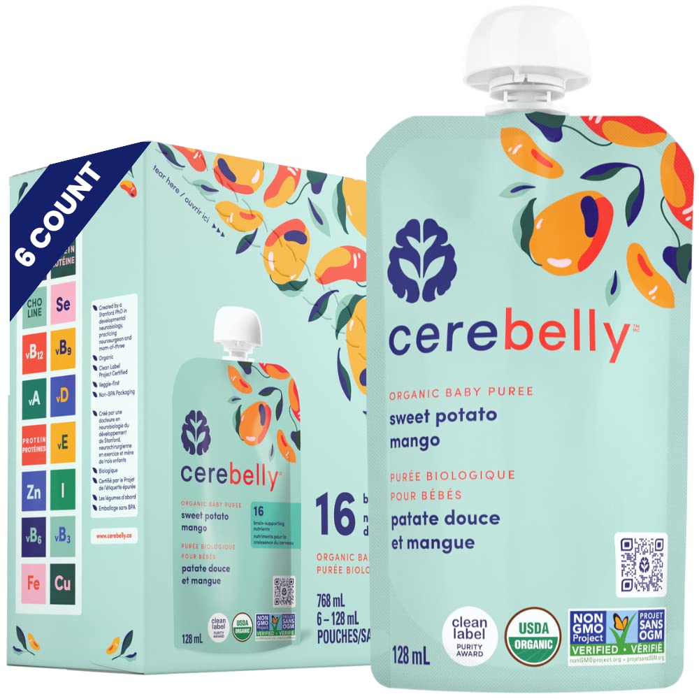 DAIRY FREE NON-GMO - Give your baby the nourishment they need to grow healthy and strong with our Sweet Potato Mango baby puree pouches. Little brains everywhere can enjoy our toddler squeeze pouches as they are made with gluten free ingredients, BPA-free, non-GMO, organic, dairy-free, nut-free, and plant derived. We take special pride in developing organic veggie pouches for toddlers that supersede all others. Cerebelly…a baby food pouch truly unlike any other!. ORGANIC INGREDIENTS - This isn't like your average applesauce squeeze pouch! Crafted from whole foods, including tart mango pureed with buttery sweet potatoes, we've put a fresh, nutritious spin on baby puree. Veggie-first and no added sugar, our organic fruit and vegetable pouches for kids gives your baby what their brain and body needs, right from the start, baby food meals perfect for every stage of development!. CLEAN LABEL AWARD SO PARENTS DON'T HAVE TO WORRY - Our toddler food pouches are Clean Label certified. We test for harmful levels of heavy metals and toxins to make sure you are feeding your little one only the highest quality baby food purees. Other companies' toddler snacks and toddler meals may fall short of testing, but Cerebelly is actually the first shelf-stable baby food to receive the Clean Label Project Purity Award. We are raising the bar for organic baby food!. SUPPORTS COGNITIVE DEVELOPMENT - Cerebelly organic baby food pouches are the only organic fruit pouch (and veggie pouch) that delivers 16 key brain-supporting nutrients studied by our founder. A delicious blend, high in Iron, Copper, Choline, and Folate supports managing speech, the development of visual processing, and cognitive abilities like emotional expression, problem solving, and memory. Other veggie pouches for toddlers lack the quality brain nutrients babies need!. SMART FOOD FOR BABIES - Our Sweet Potato Mango organic baby pouches were created by a practicing neurosurgeon, Stanford PhD in developmental neurobiology and mom-of-three. And after years of trial and error she developed the perfect baby squeeze pouches. With tasty ingredients and science-backed nutrition, our baby food puree pouches are the best baby snacks (and toddler foods) for your child's growing brain. Our organic veggie squeeze pouches have astonished moms everywhere.