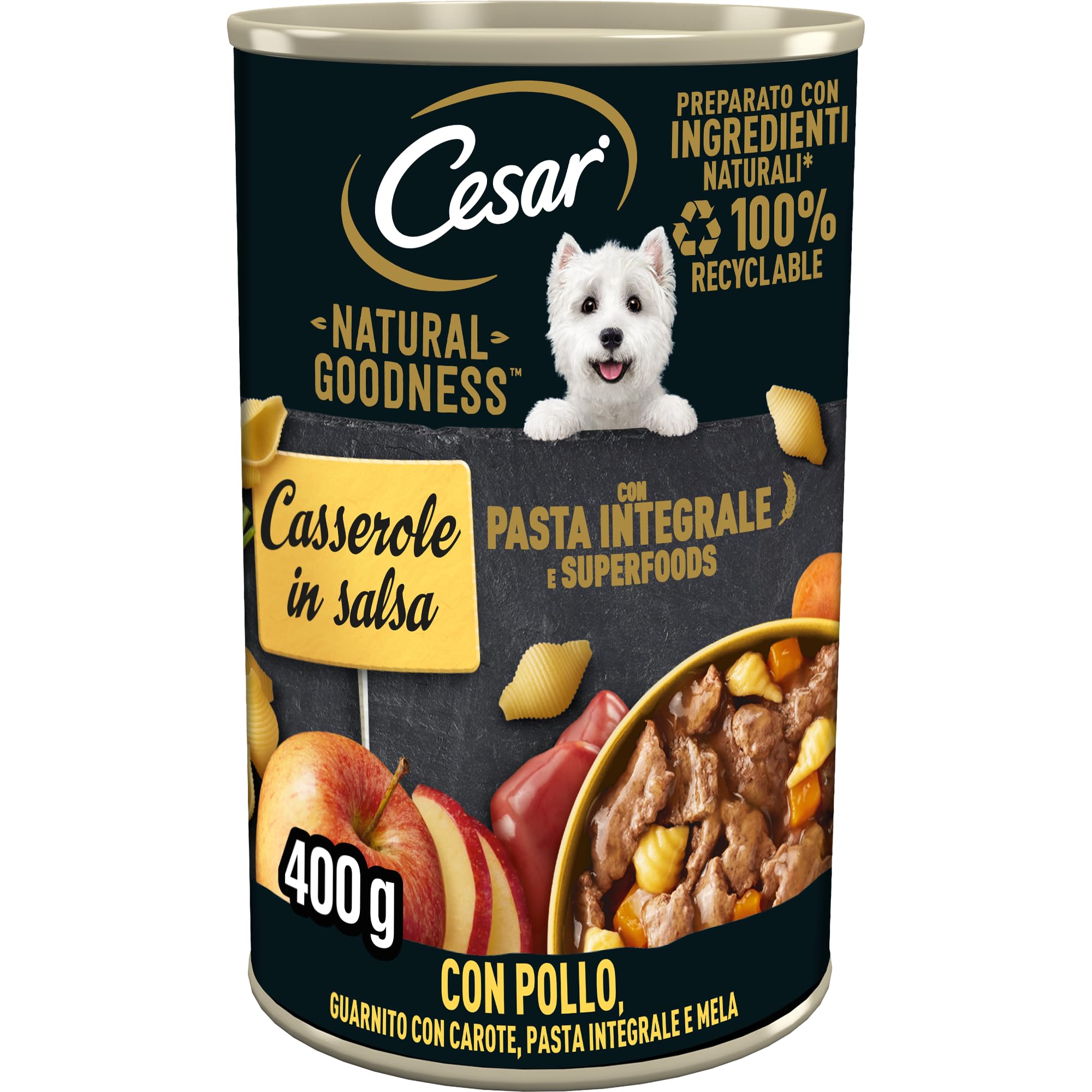 Complete wet food for adult dogs. INGREDIENTS Composition: meat and derivatives (including chicken 4 , liver 4 ), by-products of vegetable origin (including chicory extract 0.07 ), vegetable protein extracts, bakery products (including 1.1 wholemeal dough, equivalent to 4 boiled dough), cereals, vegetables (including dried carrots 0.6 , equivalent to carrots 4 ), mineral substances, aromatic herbs. , Fruits (including apple powder 0.01 ). Natural ingredients 95 natural."Age group: All ages. Caring for your four-legged friend starts with a good diet, which is why the new Cesar recipes represent the excellent balance between nutrition and taste. Wet food with no added sugar or artificial flavors, made with carefully selected 100 natural ingredients. A completely grain-free food packaged in practical, fully recyclable 400g cans. Rich in meat and with the addition of fruits and vegetables, for an excellent taste experience and a diet rich in micronutrients. Aliment humide complet pour chiens adultes. INGRÉDIENTS Composition : viandes et dérivés (dont poulet 4 , foie 4 ), sous-produits d'origine végétale (dont extrait de chicorée 0,07 ), extraits de protéines végétales, produits de boulangerie (dont 1.1 de pâte intégrale, équivalent à 4 de pâte bouillie), céréales, légumes (dont carottes séchées 0.6 , équivalent à carottes 4 ), substances Minéraux, herbes aromatiques. , Fruits (dont pomme en poudre 0.01 ). Ingrédients naturels 95 naturel."Groupe d'âge : tous les âges. Le soin de votre ami à quatre pattes commence par une bonne alimentation, c'est pourquoi les nouvelles recettes Cesar représentent l'excellent équilibre entre nutrition et goût. Nourriture humide sans sucre ajouté et arômes artificiels composé d'ingrédients 100 d'origine naturelle soigneusement sélectionnés. Un aliment entièrement grain free conservé dans des canettes pratiques entièrement recyclables de 400 g. Riche en viande et avec l'ajout de fruits et légumes, pour une excellente expérience de goût et une alimentation riche en micronutriments.