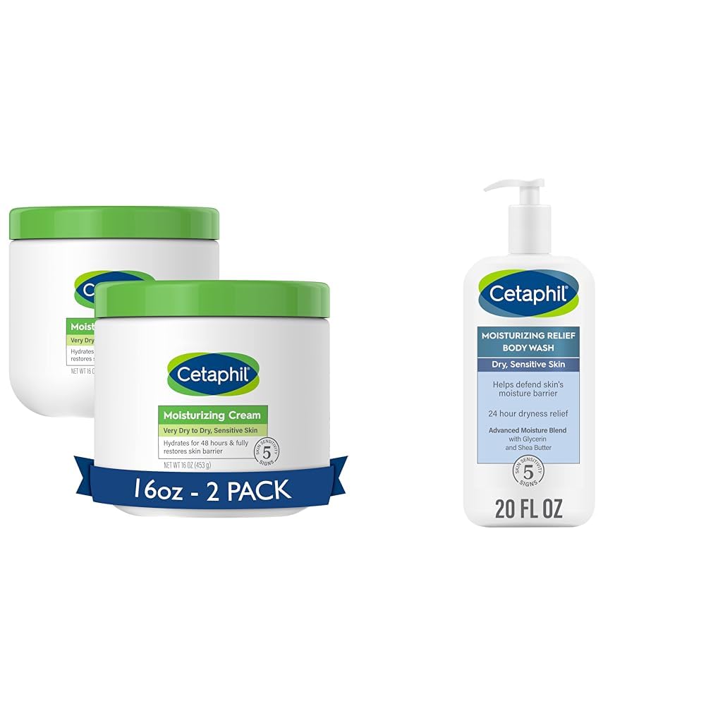 Cetaphil Body Moisturizer, Hydrating Moisturizing Cream for Dry to Very Dry, Sensitive Skin, NEW 16 oz 2 Pack, Fragrance Free, Non-Comedogenic, Non-Greasy Care for your dry to very dry skin with CETAPHIL Moisturizing Cream, a non-greasy, moisture rich cream for the whole body. Enriched with sweet almond oil and vitamin E, it immediately comforts and instantly hydrates dry, sensitive skin. Formulated with a new blend of key ingredients: hydrating glycerin, panthenol (vitamin B5) to hydrate, soothe and preserve the skin barrier, and niacinamide (vitamin B3) to help smooth skin texture and retain skin moisture barrier. For long lasting hydration, this extra strength moisturizer binds water to the skin to deeply replenish the skins moisture and prevent moisture loss, hydrating and soothing skins dryness for 48 hours and completely restoring the skins moisture barrier in one week. Ideal for very dry areas of skin on the hands, feet, elbows and knees, leaving your skin feeling soft, smooth and nourished. This fragrance free, paraben free, and sulfate free formula will not clog pores and is clinically tested for even the most gentle skin. Effectively defends against 5 signs of skin sensitivity. Cetaphil Body Wash, NEW Moisturizing Relief Body Wash for Sensitive Skin, Creamy Rich Formula Gently Cleanses and Gives 24 Hr Relief to Dry Skin,Hypoallergenic, Fragrance Free, 20 oz CETAPHIL Moisturizing Relief Body Wash is designed to gently cleanse dry, sensitive skin, with a rich, creamy texture that instantly leaves skin feeling silky soft. Formulated with an Advanced Moisture Blend made up of glycerin, shea butter and soybean oil to provide 24 hour relief from dryness, helping to prevent the drying effects of water. It soothes as it cleanses with a blend of ultra-moisturizing ingredients including avocado oil, sweet almond oil and shea butter. Dermatologist tested and specifically formulated for sensitive skin, CETAPHIL Moisturizing Relief Body Wash is hypoallergenic, fragrance, paraben and sulfate free.Product 2: SOOTHES LEAVING SKIN FEELING SOFT: Soothes for instant and 24-hour dryness relief leaving skin feeling soft with a blend of ultra-moisturizing ingredients including avocado oil, sweet almond oil, and shea butter. Product 2: PROVIDES 24 HOUR DRYNESS RELIEF WITH ADVANCED MOISTURE BLEND: Formula with Advanced Moisture Blend including Glycerin, Shea Butter and Soybean Oil provides 24-hour dryness relief. Product 1: DEVELOPED FOR EVEN THE MOST SENSITIVE SKIN: The hypoallergenic, non-comedogenic formula is free of fragrances, parabens and sulfates. Product 1: NEW AND IMPROVED INGREDIENT BLEND: Now with hydrating glycerin and skin essential vitamins B5 (panthenol) and B3 (niacinamide). Product 1: CLINICALLY PROVEN TO RESTORE SKIN'S MOISTURE BARRIER IN 1 WEEK: Binds water to the skin, preventing moisture loss to hydrate and protect skin from dryness. Product 1: CETAPHIL BODY MOISTURIZING CREAM FOR DRY TO VERY DRY SKIN: Instantly replenishes, intensely nourishes and soothes skin dryness for 48 hours.