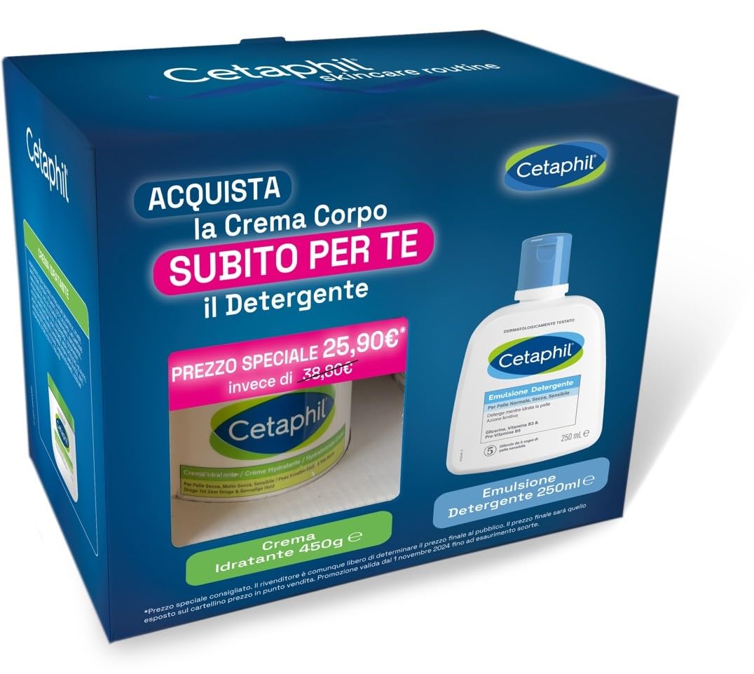Cetaphil Moisturizing Face and Body Cream for Dry, Sensitive, and Damaged Skin, 450g: For dry, very sensitive skin. Also indicated for rehydrating skin damaged by dermatological treatments or skin conditions such as psoriasis, rosacea, and eczema. Quickly and effectively hydrates the skin by reducing transepidermal water loss and restoring the skin's hydrolipidic film. Its action is immediate, providing relief and softness from the first application. Suitable for face and body. Apply Cetaphil Moisturizing Cream with a gentle massage. Use frequently as needed or as directed by a dermatologist. Cetaphil Cleansing Emulsion, 250ml: For sensitive, dry, and intolerant skin. The pH-balanced formula protects the skin during daily cleansing by helping to maintain essential hydration. The skin is effectively cleansed of all impurities, preventing dryness. Suitable for makeup removal. Also suitable for babies' and children's skin, damaged skin, or skin that has undergone drug treatments. Safe for very sensitive skin due to rosacea, psoriasis, and eczema. Fragrance-free - Soap-free - Non-foaming - Highly tolerable. For face and body. 250 ml bottle.Directions for use: Cetaphil Moisturizing Cream 450g. Apply Cetaphil Moisturizing Cream by gently massaging it in. Use frequently as needed or as directed by a dermatologist. Cetaphil Cleansing Emulsion 250ml. Apply to the skin and massage gently. Without water: remove the product with cotton with water: rinse and dry thoroughly. Skin type: Cetaphil Moisturizing Cream 450g. Indicated for those with dry, very dry, sensitive, or damaged skin due to skin conditions such as psoriasis, rosacea, and eczema Cetaphil Cleansing Emulsion 250ml is also indicated for the skin of babies and children, damaged skin, or skin undergoing medical treatments safe even on sensitive skin due to rosacea, psoriasis, and eczema. Action: Cetaphil Moisturizing Cream 450g quickly and effectively hydrates the skin, reducing transepidermal water loss and restoring the skin's natural hydrolipidic film. Benefits: Cetaphil Moisturizing Cream 450g is also indicated for rehydrating skin damaged following dermatological treatments or skin conditions such as psoriasis. Cetaphil Cleansing Emulsion 250ml. The skin is effectively cleansed of all impurities while preventing a feeling of dryness it moisturizes the skin quickly and for up to 4 days after application. Formula: Cetaphil Moisturizing Cream 450g helps maintain the skin's protective barrier, with a soothing effect fragrance-free, lanolin-free high tolerance and non-comedogenic Cetaphil Cleansing Emulsion 250ml. The pH-balanced formula protects the skin during daily cleansing by helping it maintain the necessary moisture for face and body. Fragrance-free, soap-free. One-step, non-foaming.Cetaphil Bundle Crème Hydratante 450 g Emulsion Nettoyant 250 mlDESCRIPTION DU PRODUIT Cetaphil Crème hydratante visage et corps pour peau sèche, sensible et endommagée, 450 g : pour peau sèche, très sensible Également indiquée pour réhydrater la peau endommagée suite à des traitements dermatologiques ou des troubles cutanés tels que le psoriasis, la rosacée et l'eczéma. Hydrate rapidement et efficacement la peau, en diminuant la perte d'eau transépidermique et en restaurant le bon film hydrolipidique cutané. Son action est immédiate et dès la première application apporte soulagement et douceur. Convient pour le visage et le corps. Appliquer cetaphil crème hydratante en massant doucement. Utiliser également fréquemment si nécessaire ou selon les indications du dermatologue. Cetaphil, émulsion nettoyante, 250 ml : pour peau sensible, sèche et intolérante. La formule au pH équilibré protège la peau pendant le nettoyage quotidien en aidant à maintenir l'hydratation nécessaire. La peau est ainsi nettoyée de manière efficace de toutes les impuretés en évitant la sensation de sécheresse cutanée. Convient pour le retrait du maquillage. Indiqué également pour la peau des bébés et des enfants, peau endommagée ou ayant subi des traitements médicamenteux. Sans danger pour la peau très sensible due à la rosacée, au psoriasis et à l'eczéma. Sans parfum - Sans savon - Non moussant - Grande tolérance Pour le visage et le corps Flacon de 250 ml.Mode d'utilisation : crème hydratante Cetaphil 450 g. Appliquer Cetaphil crème hydratante en massant doucement. Utilisez également fréquemment si nécessaire ou selon les indications du dermatologue. Cetaphil Emulsion Nettoyant 250 ml. Appliquer sur la peau et masser doucement. Sans eau : enlever le produit avec du coton avec de l'eau : rincer et sécher soigneusement. Type de peau : crème hydratante Cetaphil 450 g. Indiquée pour ceux qui ont la peau sèche, très sèche, sensible ou endommagée par des troubles cutanés tels que le psoriasis, la rosacée et l'eczéma cétaphil émulsion nettoyante 250 ml également indiquée pour la peau des bébés et des enfants, peau endommagée ou soumise à des traitements médicamenteux sûr même sur la peau sensible due à la rose acea, psoriasis et eczéma. Action : crème hydratante Cetaphil 450 g hydrate rapidement et efficacement la peau, en diminuant la perte d'eau transépidermique et en restaurant le bon film hydrolipidique cutané. Avantages : crème hydratante Cetaphil 450 g également indiquée pour réhydrater la peau endommagée suite à des traitements dermatologiques ou des troubles cutanés comme le psoriasis. Cetaphil Emulsion Nettoyant 250 ml. La peau est ainsi nettoyée de manière efficace contre toutes les impuretés en évitant la sensation de sécheresse cutanée hydrate la peau rapidement et longtemps, jusqu'à 4 jours après Application :. Formule : crème hydratante Cetaphil 450 g aide à maintenir la barrière protectrice de la peau, avec un effet apaisant sans parfum, sans lanoline à haute tolérance et non comédogène cétaphil émulsion Dtergente 250 ml Le pH équilibré protège la peau pendant le nett