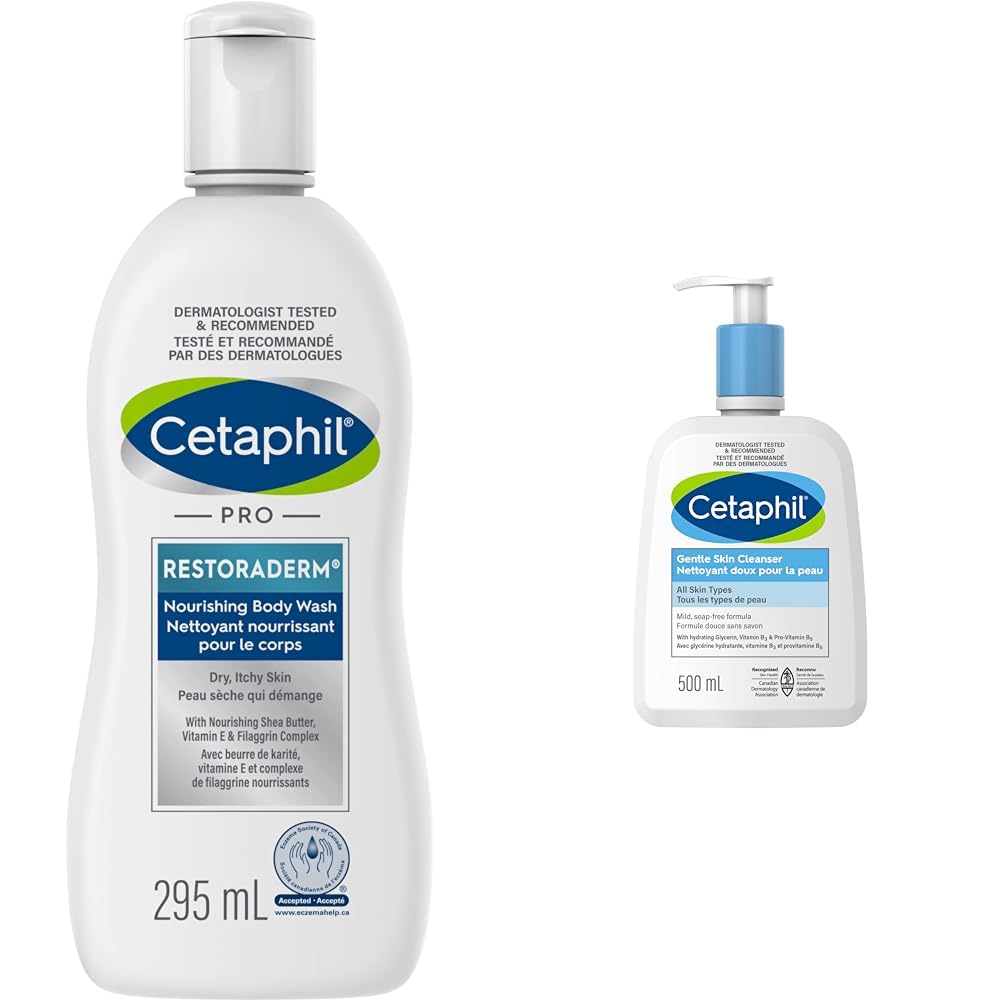 Cetaphil PRO RestoraDerm Nourishing Body Wash With Filaggrin and Shea Butter - Non Soap Cleanser For Dry Itchy and Sensitive Skin - Fragrance Free, Paraben Free - Dermatologist Recommended, 295ml Cetaphil RESTORADERM Nourishing Body Wash Filaggrin technology improves the skin’s ability to retain moisture. Miracare cleansing technology delivers skin nourishing oils in a soap-free formula. This gentle, non-drying wash cleanses, hydrates and soothes dry, itchy skin. Perfect for the entire family and total body use. Pediatrician recommended. Cetaphil Gentle Skin Cleanser (500ml) - Hydrating Face Wash & Body Wash - Ideal for Sensitive, Dry Skin - Non-Irritating, Fragrance-Free and Dermatologist Recommended Cetaphil Gentle Skin Cleanser is a mild, soap-free formula that cleanses without irritation. It protects the skin’s natural protective oils and natural pH to moisturize and soothe sensitive skin as it cleans. Gentle enough for baby’s delicate skin or as a makeup remover.Both products are non-comedogenic (won't clog pores), hypoallergenic, and clinically tested for sensitive skin, with the Cetaphil Gentle Skin Cleanser suitable for daily facial and body cleansing. Cetaphil Gentle Skin Cleanser can be used with or without water, providing 48-hour hydration when used without water, and effectively removes dirt, oil, impurities, and makeup through gentle micellar technology. Cetaphil PRO RestoraDerm Body Wash features Filaggrin technology to improve skin's moisture retention and Miracare cleansing technology that delivers nourishing oils in a soap-free formula for gentle, non-drying cleansing. Cetaphil Gentle Skin Cleanser (500ml) - Hydrating, non-irritating, fragrance-free, and dermatologist-recommended face and body wash, ideal for dry to normal, sensitive skin, with hydrating glycerin and skin-essential vitamins. Cetaphil PRO RestoraDerm Nourishing Body Wash with Filaggrin and Shea Butter - Non-soap, fragrance-free, and paraben-free cleanser for dry, itchy, and sensitive skin, dermatologist recommended for the whole family, including infants 3+ months.