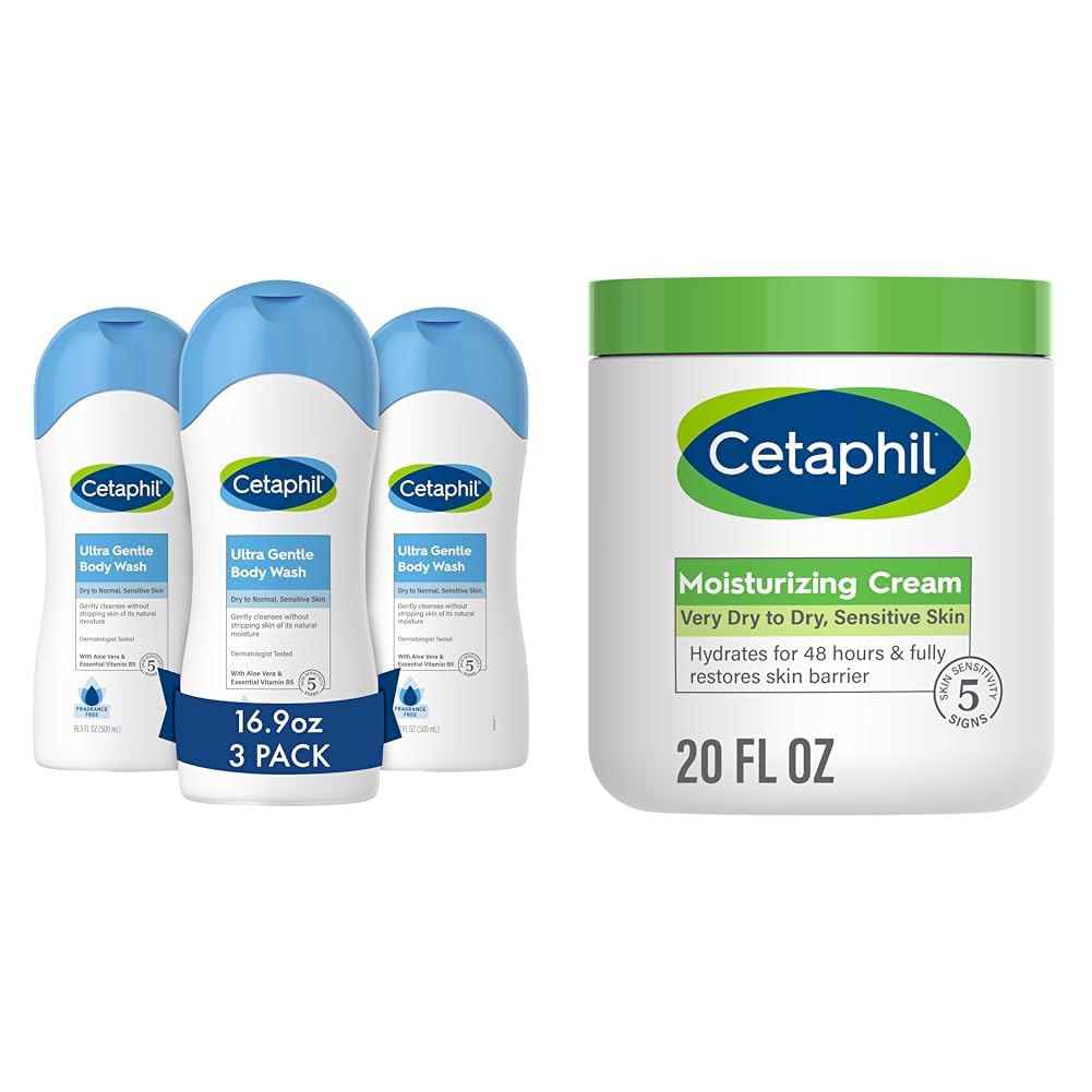 Cetaphil Ultra Gentle Body Wash, 16.9oz Pack of 3 - For Dry to Normal, Sensitive Skin, With Aloe Vera, Calendula, Vitamin B5, Hypoallergenic, Paraben Fragrance Free, Dermatologist Tested Cetaphil Ultra Gentle Body Wash gently cleanses even the most sensitive skin without stripping it of its natural moisture, while delivering nourishing ingredients to help maintain the skins moisture barrier. Contains Aloe Vera, Vitamin B5 and a unique combination of moisturizers that leave skin feeling clean, soft and replenished during and after shower. Cetaphil Body Moisturizer, Hydrating Moisturizing Cream for Dry to Very Dry, Sensitive Skin, NEW 20 oz, Fragrance Free, Non-Comedogenic, Non-Greasy Care for your dry to very dry skin with CETAPHIL Moisturizing Cream, a non-greasy, moisture rich cream for the whole body. Enriched with sweet almond oil and vitamin E, it immediately comforts and instantly hydrates dry, sensitive skin. Formulated with a new blend of key ingredients: hydrating glycerin, panthenol (vitamin B5) to hydrate, soothe and preserve the skin barrier, and niacinamide (vitamin B3) to help smooth skin texture and retain skin moisture barrier. For long lasting hydration, this extra strength moisturizer binds water to the skin to deeply replenish the skins moisture and prevent moisture loss, hydrating and soothing skins dryness for 48 hours and completely restoring the skins moisture barrier in one week. Ideal for very dry areas of skin on the hands, feet, elbows and knees, leaving your skin feeling soft, smooth and nourished. This fragrance free, paraben free, and sulfate free formula will not clog pores and is clinically tested for even the most gentle skin. Effectively defends against 5 signs of skin sensitivity.Product 2: DEVELOPED FOR EVEN THE MOST SENSITIVE SKIN: The hypoallergenic, non-comedogenic formula is free of fragrances, parabens and sulfates. Product 2: NEW AND IMPROVED INGREDIENT BLEND: Now with hydrating glycerin and skin essential vitamins B5 (panthenol) and B3 (niacinamide). Product 2: CLINICALLY PROVEN TO RESTORE SKIN'S MOISTURE BARRIER IN 1 WEEK: Binds water to the skin, preventing moisture loss to hydrate and protect skin from dryness. Product 2: CETAPHIL BODY MOISTURIZING CREAM FOR DRY TO VERY DRY SKIN: Instantly replenishes, intensely nourishes and soothes skin dryness for 48 hours. Product 1: DAILY USE: Dermatologist-tested formula is hypoallergenic,paraben free, fragrance free and noncomedogenic, so it is gentle enough to be used daily Dermatologist tested, hypollergenic, non-irritating, fragrance free and noncomedogenic. Product 1: MAINTAIN MOISTURE BARRIER: Unique formula delivers nourishing ingredients to help maintain the skin's moisture barrier during and after your shower. Product 1: SOFT, REPLENISHED SKIN: Formulated with aloe vera, vitamin B5 and a unique combination of moisturizers to leave skin feeling clean, soft and replenished. Product 1: CETAPHIL ULTRA GENTLE BODYWASH: Gentle formula cleanses even the most sensitive skin without stripping it of its natural moisture.