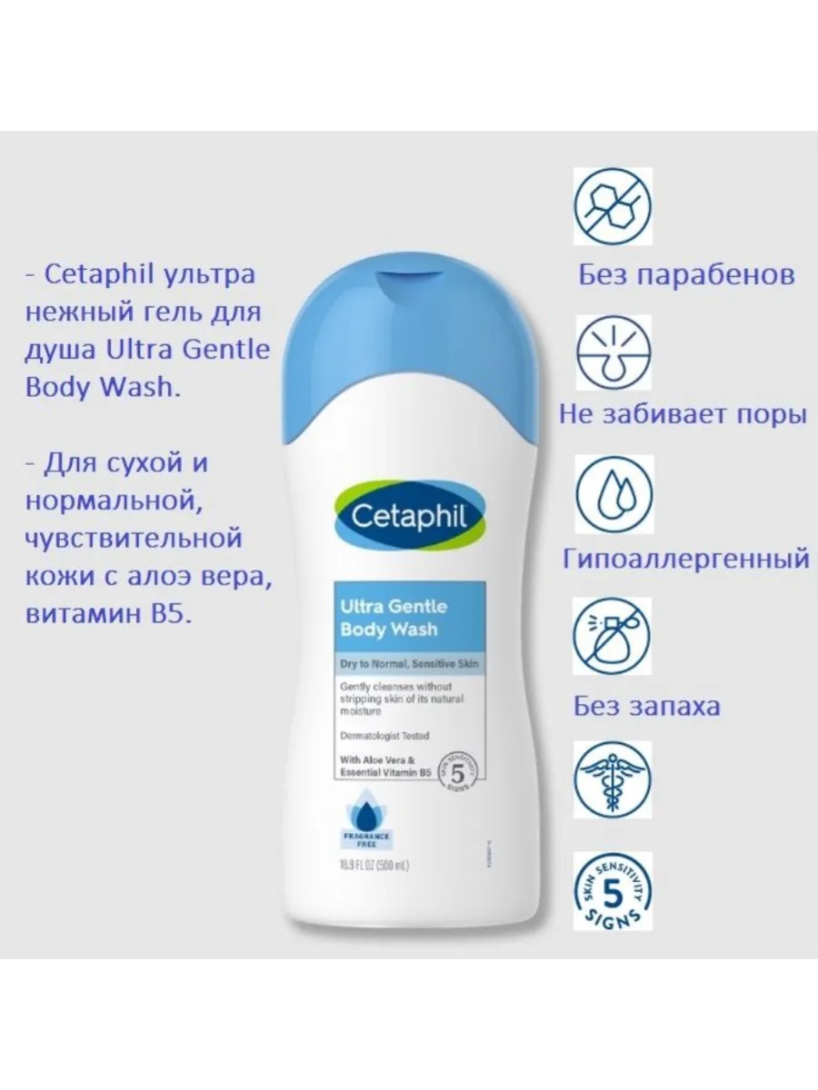 Cetaphil ультра нежный гель для душа Ultra Gentle Body Wash, 500 мл. Тип кожи: Для сухой и нормальной, чувствительной кожи. Средство для умывания без отдушек мягко очищает даже самую чувствительную кожу, не лишая ее естественной влаги. Насыщен алоэ вера, витамином B5 и уникальной комбинацией увлажняющих веществ, которые делают кожу чистой, мягкой и обновленной. Содержит питательные ингредиенты, помогающие поддерживать водный барьер кожи во время и после душа. Дерматологи протестировали и клинически доказали, что средство бережно воздействует на чувствительную кожу. Мягко очищает даже самую чувствительную кожу, не лишая ее естественной влаги, а также доставляет питательные ингредиенты, помогающие поддерживать водный барьер кожи. Защищает от 5 признаков чувствительности кожи, включая ослабление кожного барьера, раздражение, шероховатость, стянутость и сухость.