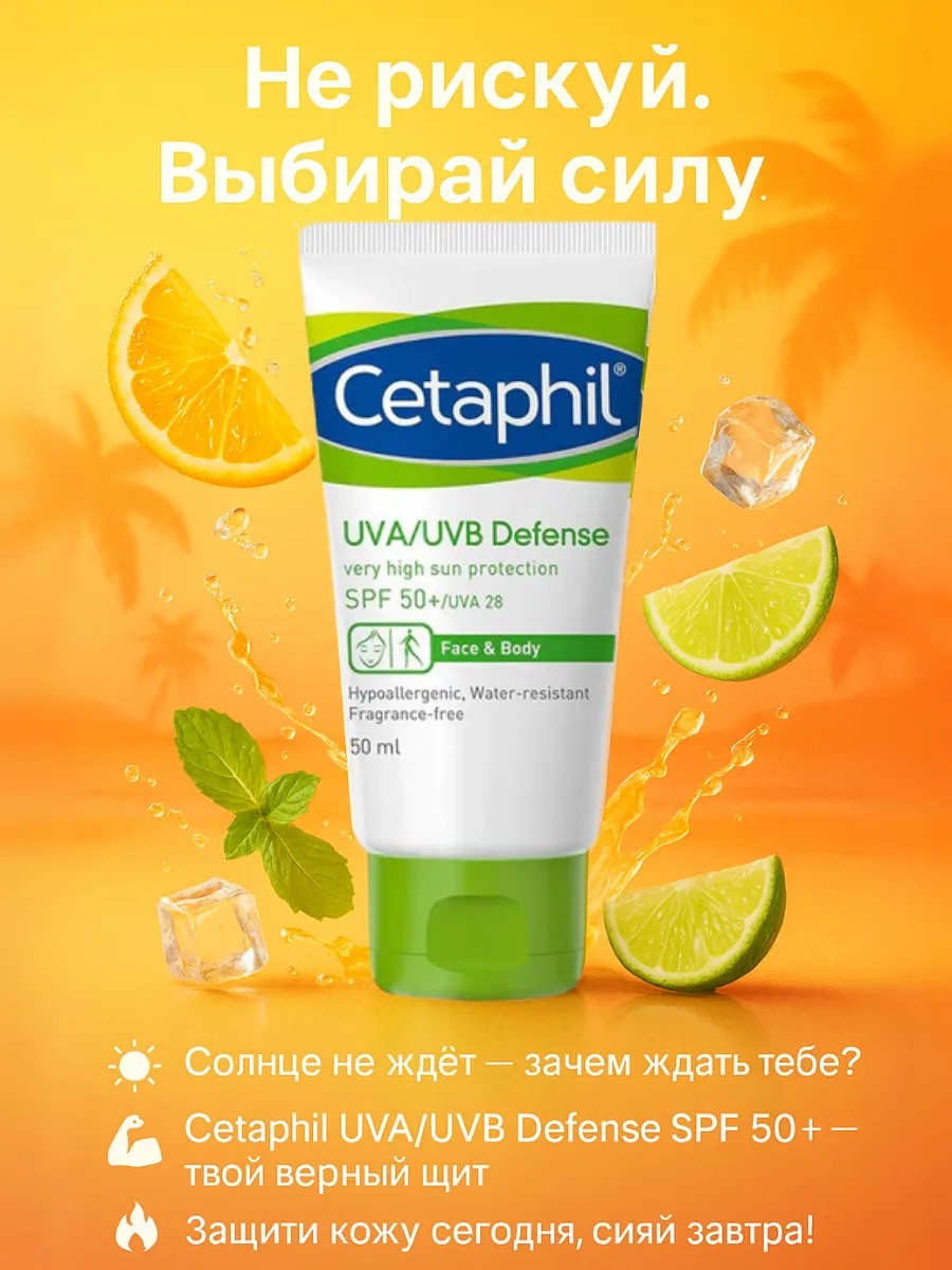 Cetaphil UVA/UVB Defense SPF 50+ — это солнцезащитный крем, созданный специально для людей с чувствительной, склонной к раздражениям кожей. Он обеспечивает широкоспектральную защиту от UVA и UVB-лучей, предотвращая не только ожоги, но и фотостарение, гиперпигментацию, повреждение клеток и потерю упругости кожи.