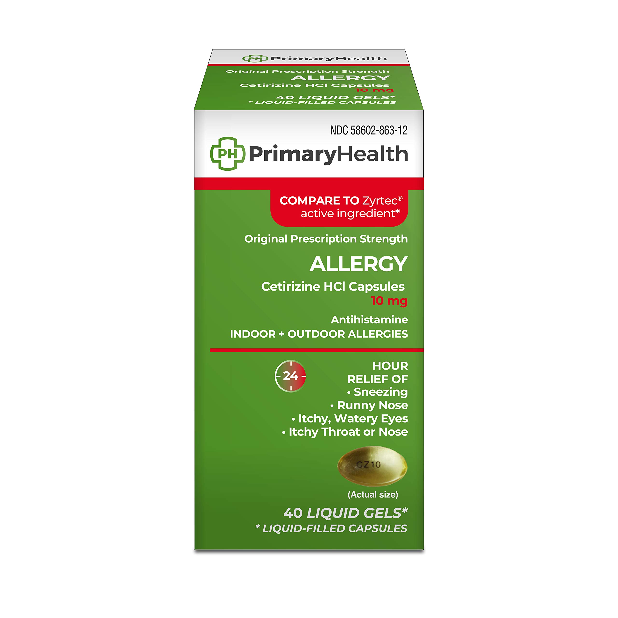 ALLERGY CAUSES: Exposure to the same allergen twice can cause antibodies to release a number of immune system chemicals, such as hisPrimary Health All Day Allergy Relief contains cetirizine hydrochloride 10 mg, an antihistamine which can help. 24 HOUR ALLERGY RELIEF: This allergy medicine provides 24 hours of relief from allergy symptoms. INDOOR OUTDOOR ALLERGY RELIEF: Temporarily relieves these symptoms due to hay fever or other upper respiratory allergies: runny nose, sneezing, itching of the nose or throat and itchy, watery eyes. ALL DAY ALLERGY RELIEF: These allergy pills are original prescription strength and provide all day relief of allergy symptoms. Each liquid gel contain 10 mg of cetirizine hydrochloride, an antihistamine. Liquid-filled capsules. ACTIVE INGREDIENT: Primary Health All Day Allergy Relief contains cetirizine hydrochloride 10 mg, an antihistamine, which compares to the active ingredient in Zyrtec Liquid Gels.
